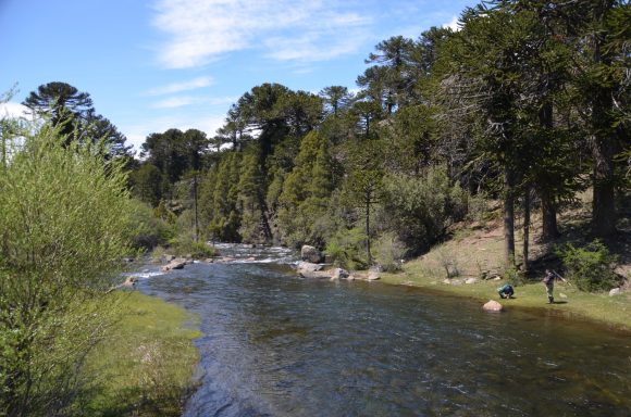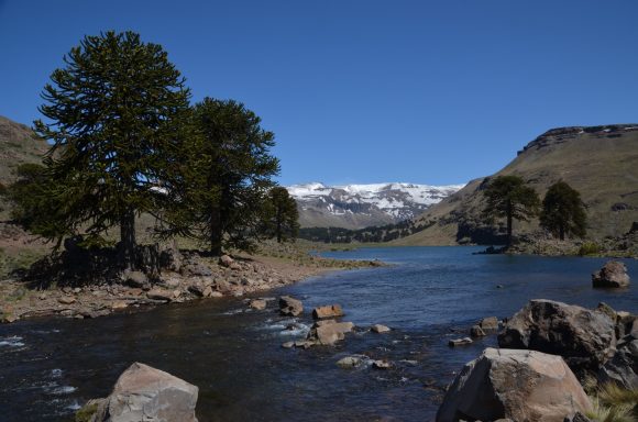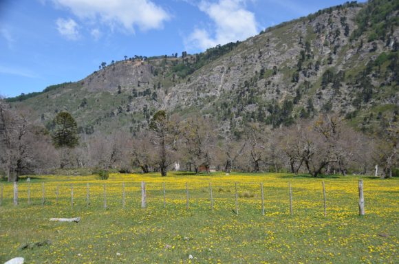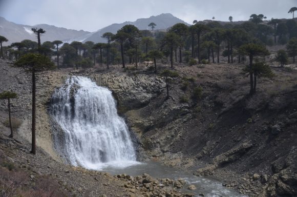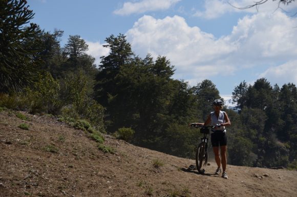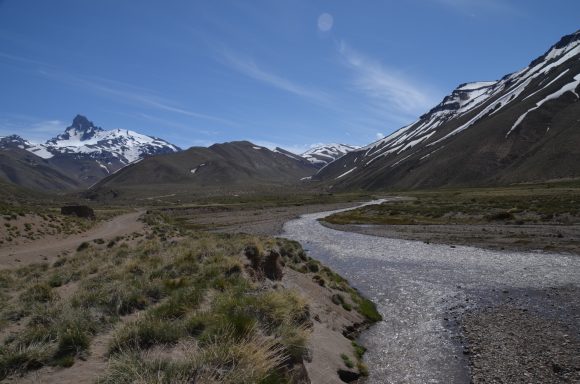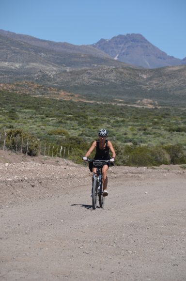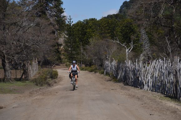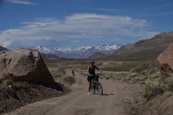 Nun folgt die Fahrt durch das Mapucheland, eine windige und anstrengende Fahrt durch die Pampa auf asphaltierter Straße (32km, 1.100m). Nicht zu sehen ist die indigene Bevölkerung; das Gebiet scheint menschenleer zu sein. Die Etappe führt über eine erudierte Wege und steile Schotterpisten zu einem Vulkan. Es blieb bei nur einem Sturz. Gut, wenn man Verbandszeug dabeihat. Es werden dann noch vier Flüsse gequert. Tipp ist, dass die Schuhe nicht ausgezogen werden, da das Flussbett rutschig ist. Die Strapazen lohnen sich jedoch: pure Landschaft!