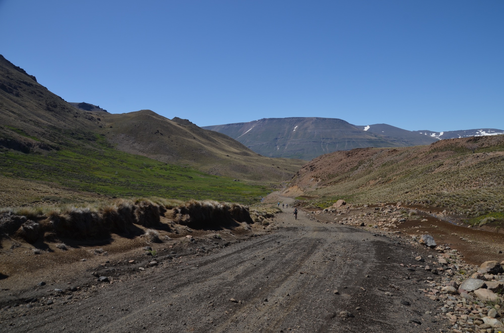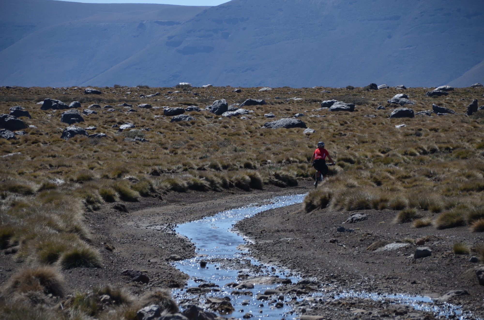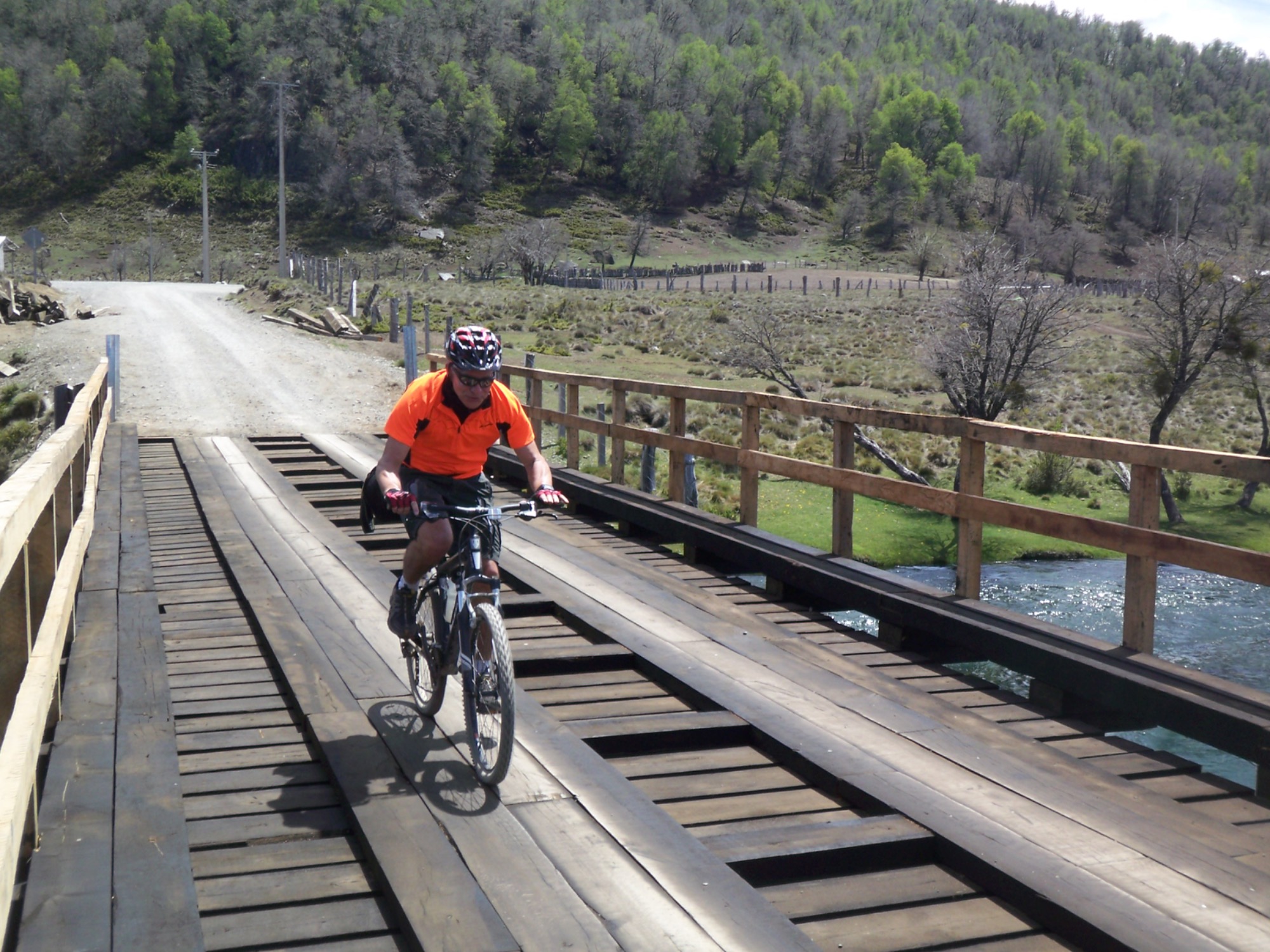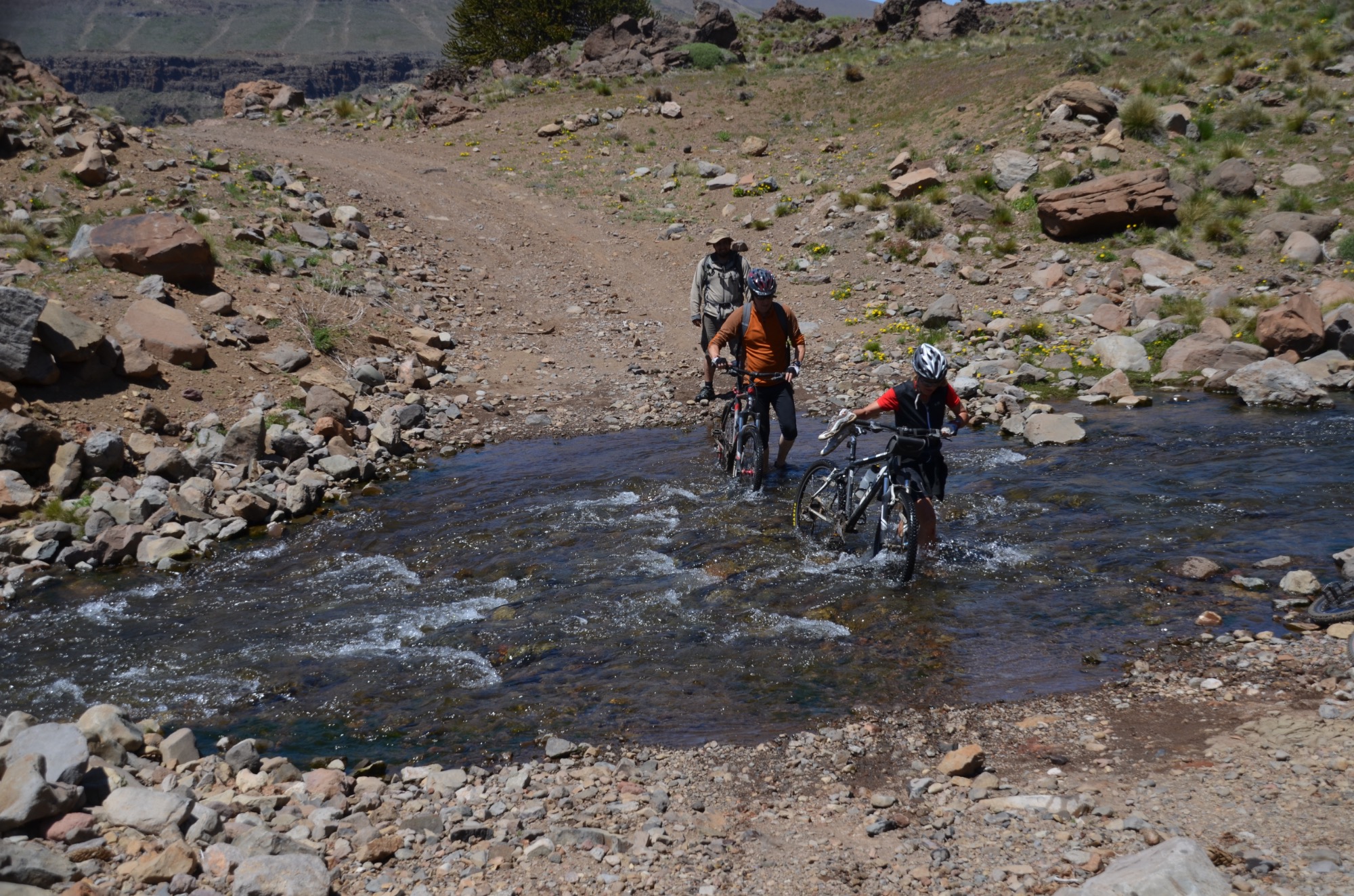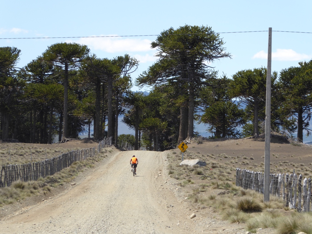 Nun folgt die Fahrt durch das Mapucheland, eine windige und anstrengende Fahrt durch die Pampa auf asphaltierter Straße (32km, 1.100m). Nicht zu sehen ist die indigene Bevölkerung; das Gebiet scheint menschenleer zu sein. Die Etappe führt über eine erudierte Wege und steile Schotterpisten zu einem Vulkan. Es blieb bei nur einem Sturz. Gut, wenn man Verbandszeug dabeihat. Es werden dann noch vier Flüsse gequert. Tipp ist, dass die Schuhe nicht ausgezogen werden, da das Flussbett rutschig ist. Die Strapazen lohnen sich jedoch: pure Landschaft!