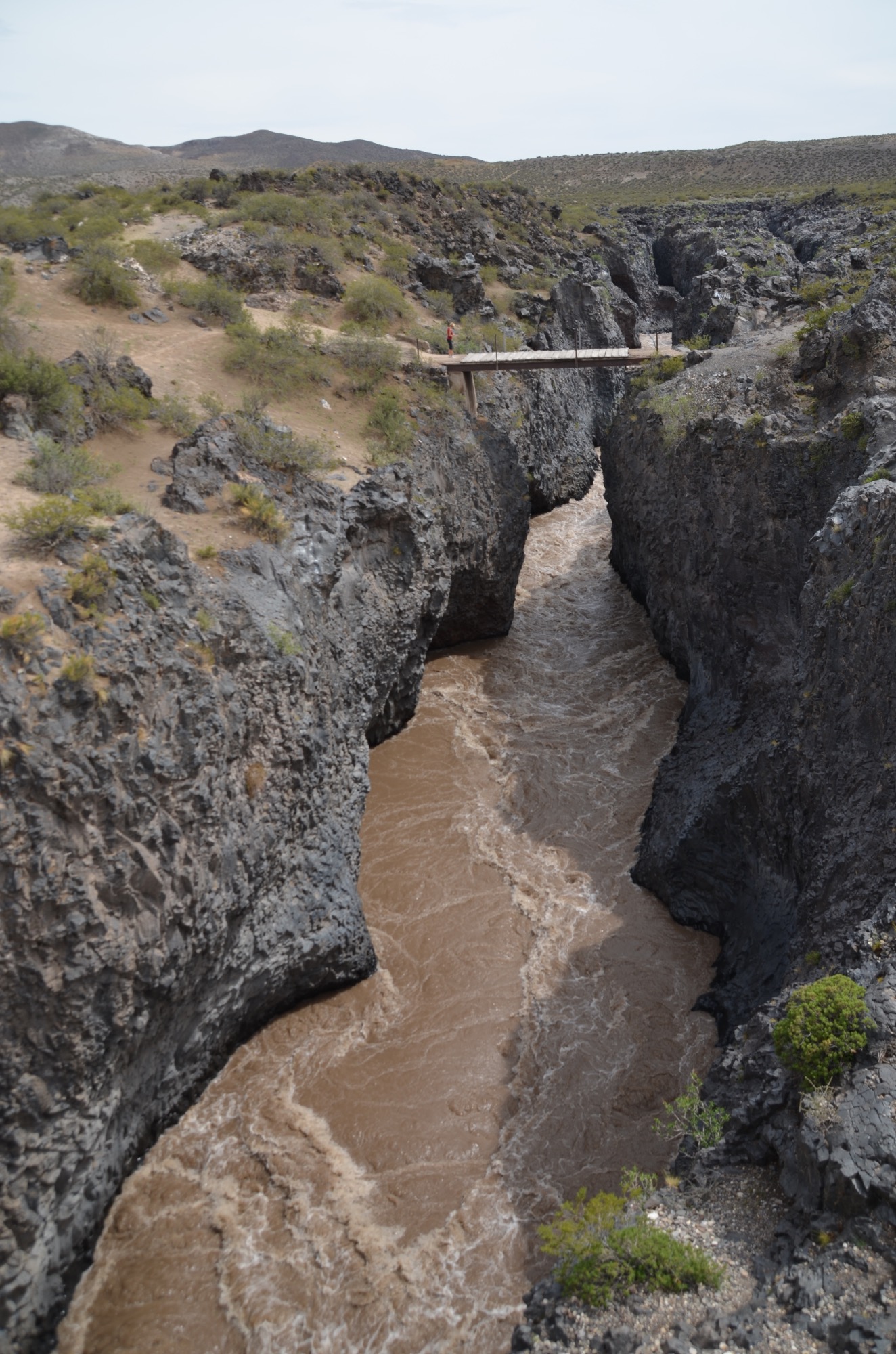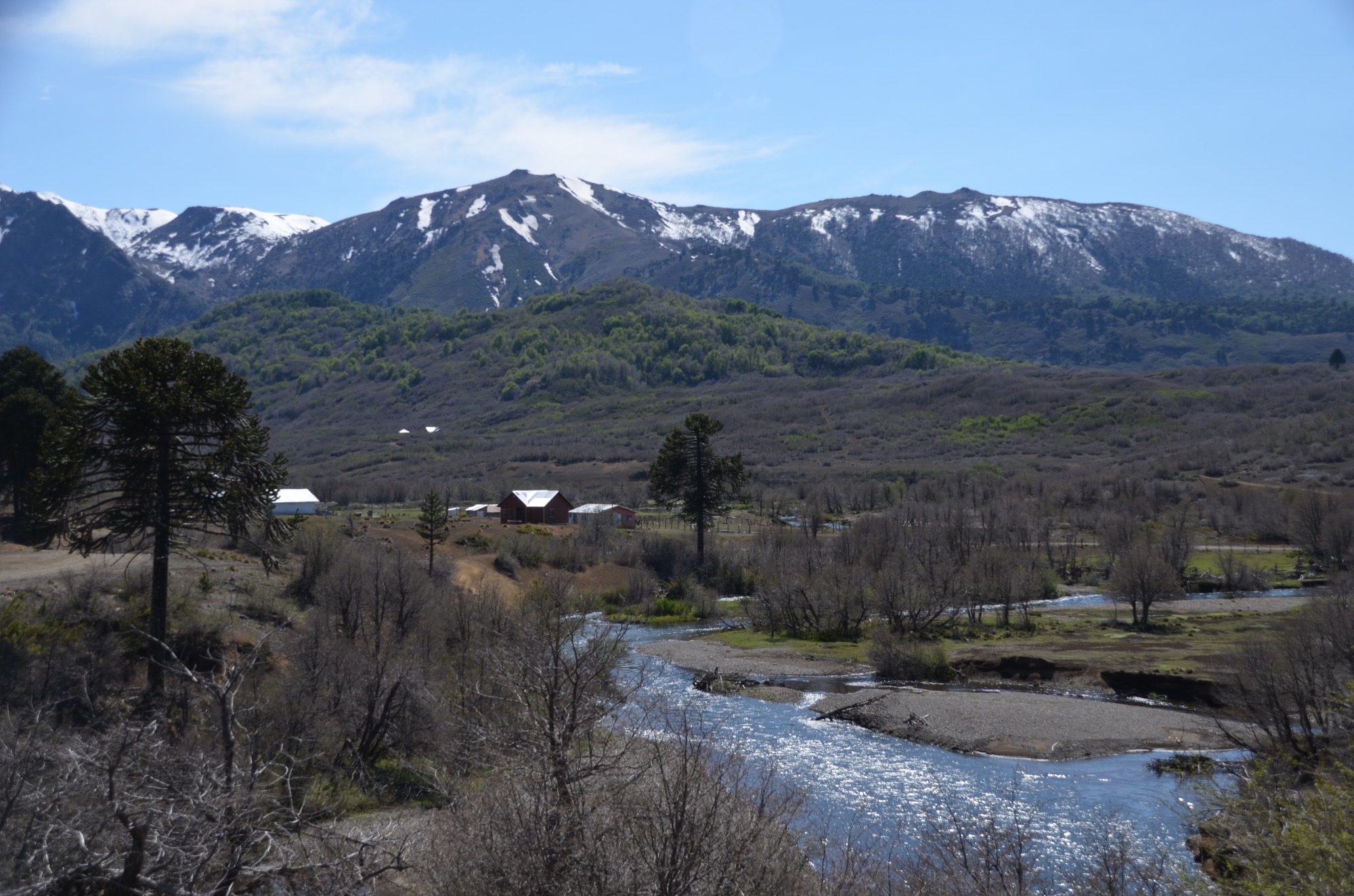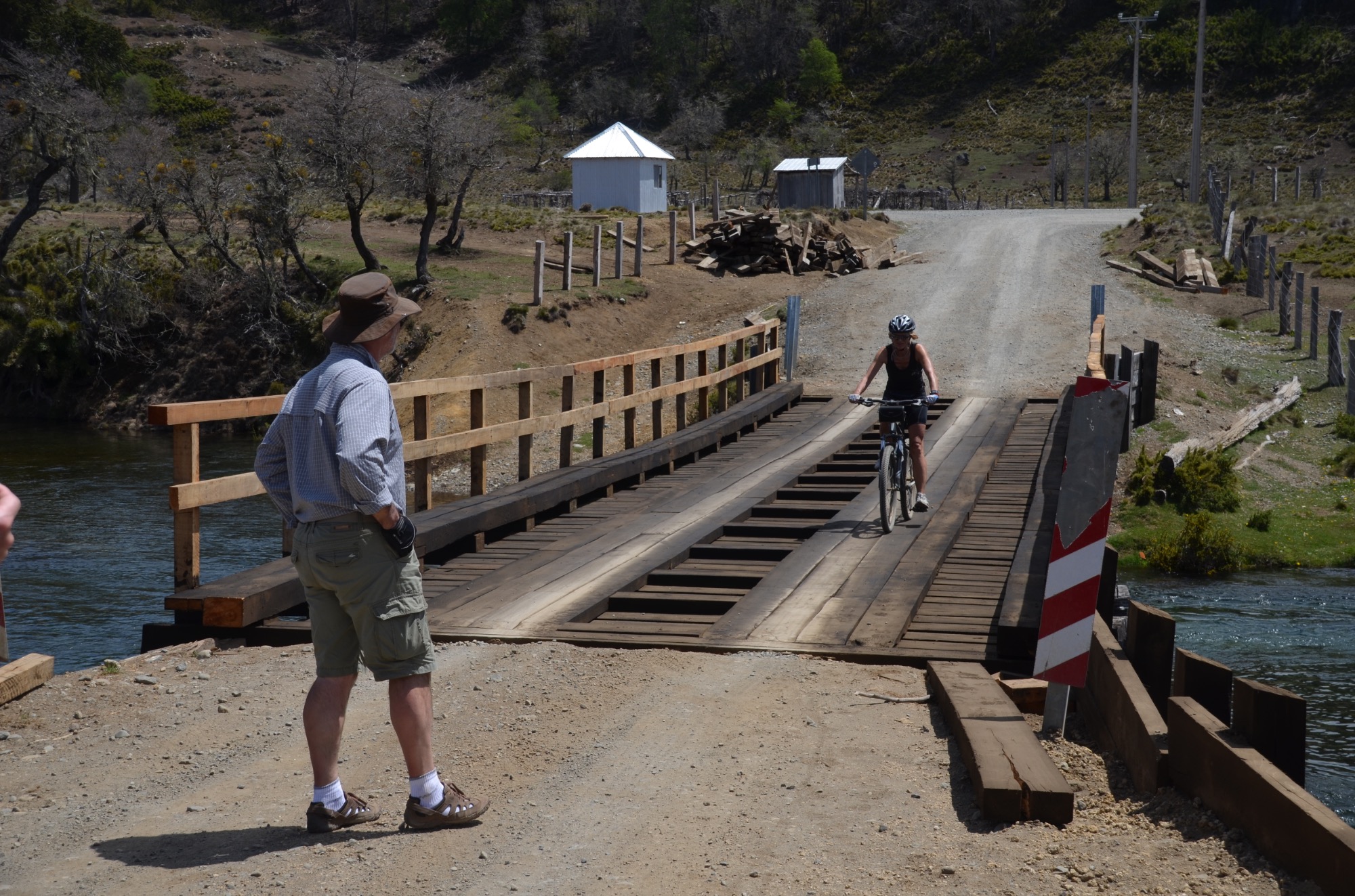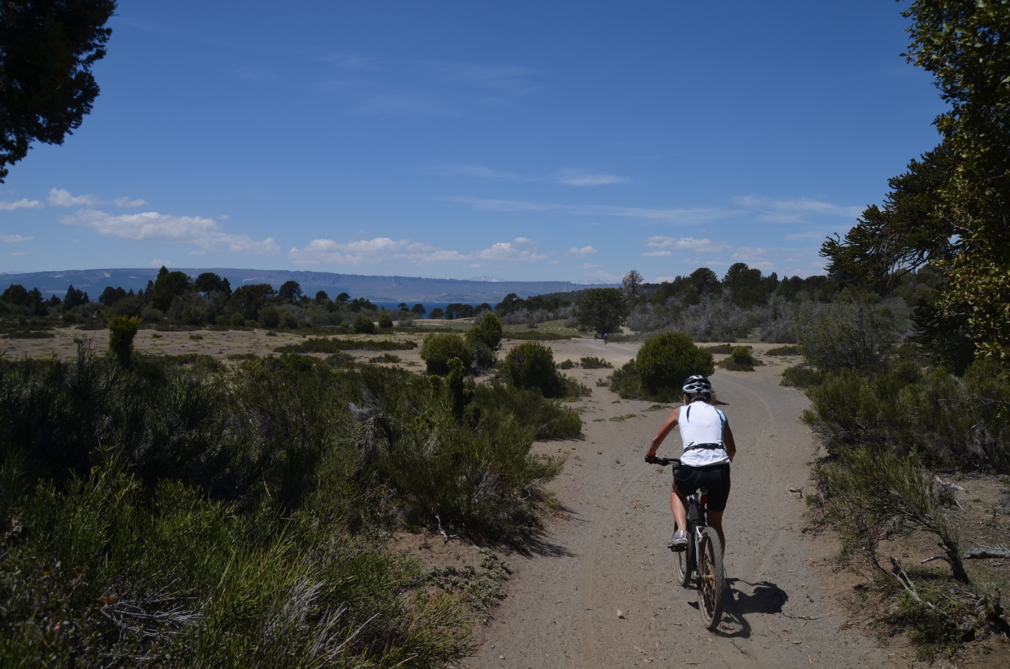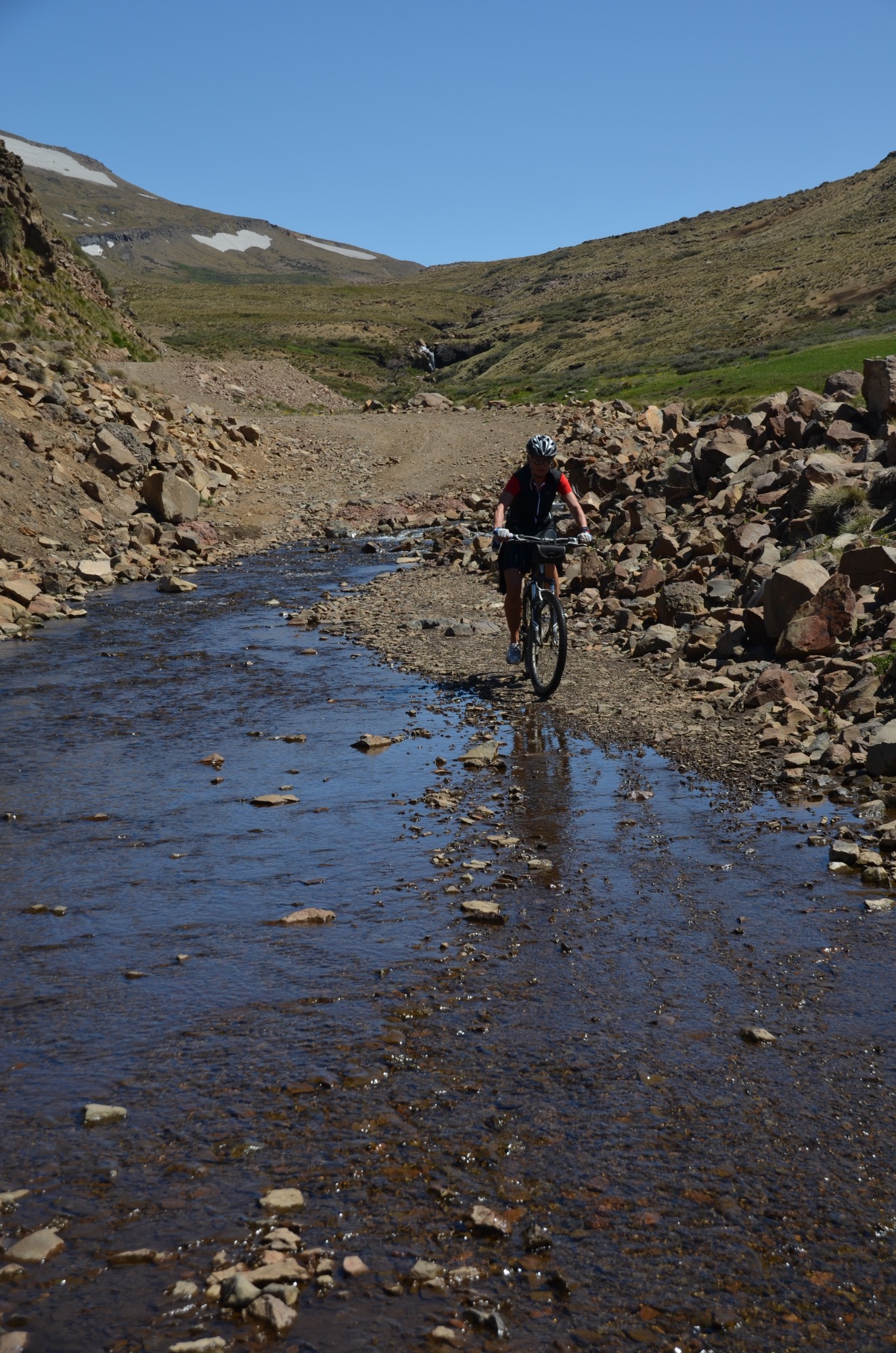 Nun folgt die Fahrt durch das Mapucheland, eine windige und anstrengende Fahrt durch die Pampa auf asphaltierter Straße (32km, 1.100m). Nicht zu sehen ist die indigene Bevölkerung; das Gebiet scheint menschenleer zu sein. Die Etappe führt über eine erudierte Wege und steile Schotterpisten zu einem Vulkan. Es blieb bei nur einem Sturz. Gut, wenn man Verbandszeug dabeihat. Es werden dann noch vier Flüsse gequert. Tipp ist, dass die Schuhe nicht ausgezogen werden, da das Flussbett rutschig ist. Die Strapazen lohnen sich jedoch: pure Landschaft!