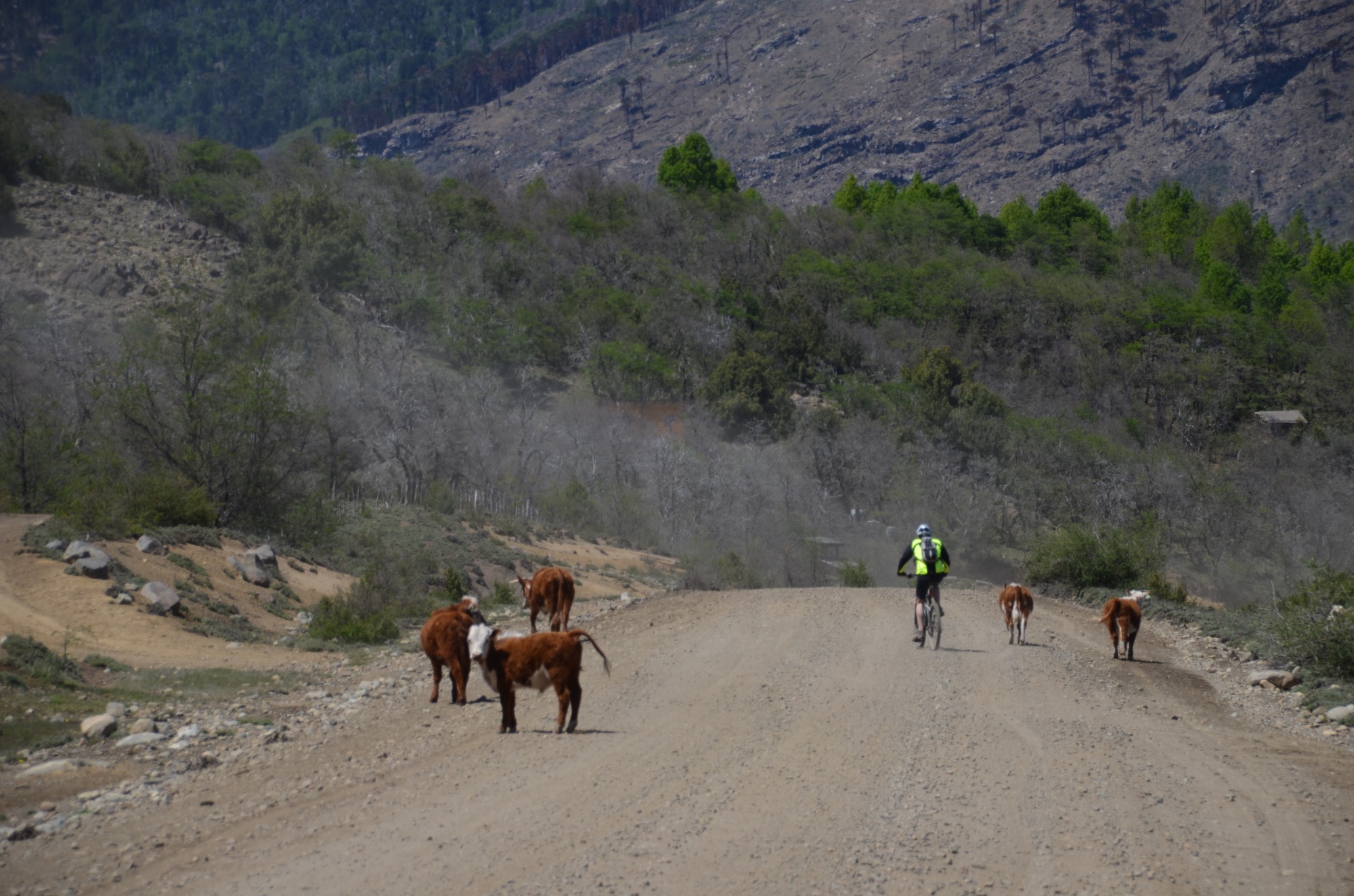 Heute steht unter anderem eine Passquerung auf dem Programm (19km, 650m) und der Vorlauf mit einer Fahrt durch Wälder mit Arakaurien (37km, 450m). Nicht zu vergessen sind natürlich unsere Begleiter auf der Piste: friedliche Hunde, Pferde und Rinder.