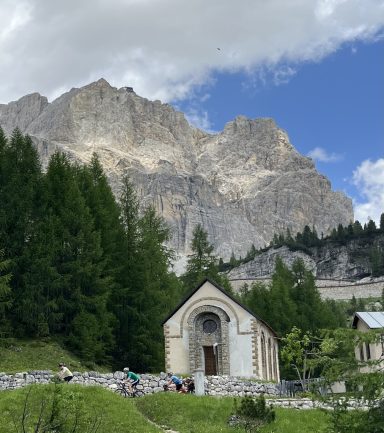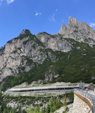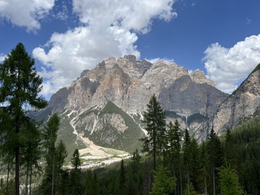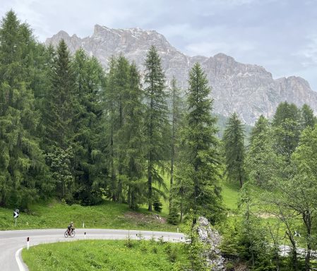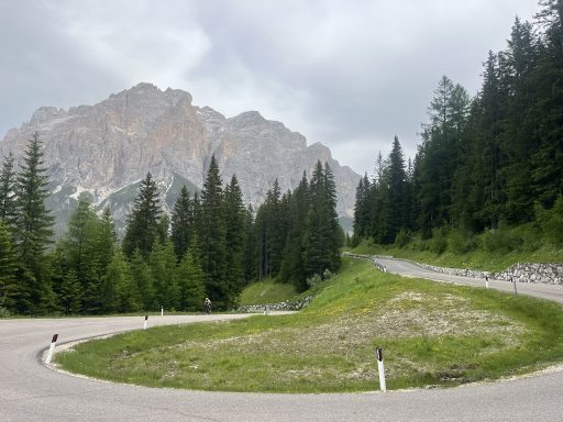Der Passo di Valparola wird von der Südseite angefahren. Es gilt ein letztes Mal eine Steigung von 10% zu bewältigen; aber der Pass ist auch nur 1,5km vom Passo di Falzarego entfernt. Auf der Passhöhe ist dann aber auch ein Fort zu bestaunen. Es folgt zum Abschluss eine lange und kurvenreiche Abfahrt mit 10% Gefälle. Hier im Gadertal kann noch einmal die Bergwelt mit der Cunturinesgruppe und die Lärchen- und Kieferwälder bestaunt werden. Schließlich erreichen wir wieder unseren Ausgangspunkt San Cassiano. Eine tolle Tour mit drei interessanten Pässen (52km; 4.400 Höhenmeter; 3:45 Stunden).