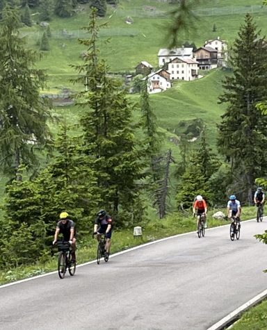 Die erste Tour (50km; 1.500m) führte uns dann auch über zwei Pässe, Valparolo und Falzarego. Der Anstieg zum Valparola war mit 8-10% Steigung moderat, die Straße war sehr gut und die Bergmassive der Dolomiten imposant. Cortina d’Ampezzo, ein Ort mit olympischer Vergangenheit, wurde für einen Kaffee und ein Stück Kuchen besucht; ansonsten bietet der Ort nichts Interessantes. Auf dem Rückweg wechselte das Wetter schlagartig und es regnete; man sollte auf solche Ereignisse vorbereitet sein (waren wir auch).