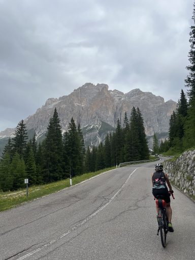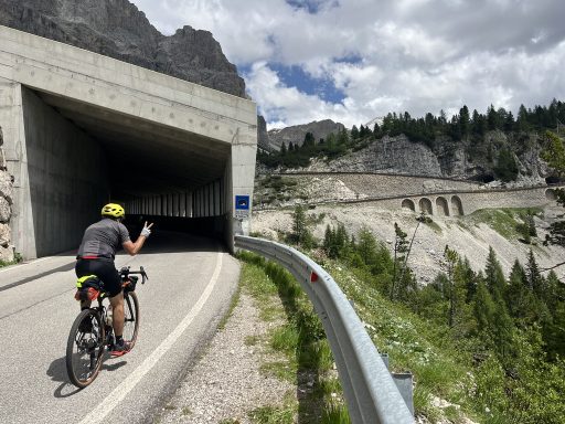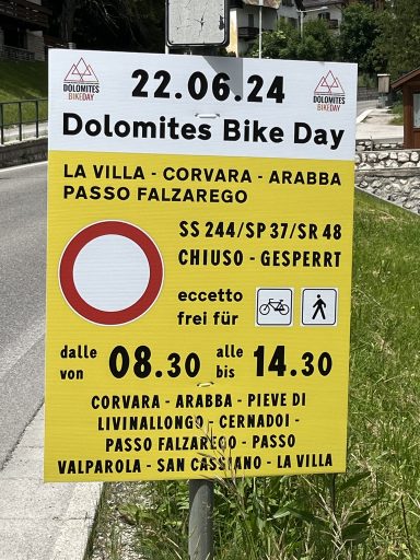 Verkehrsfreier Tag in den Dolomiten! Es gibt mehrere Möglichkeiten, in diesen Rundkurs einzutreten und die Dolomitenpässe Campolongo, Falzarego und Valparola zu bezwingen. Meist sind Rennräder auf der Piste, aber auch MTB sind möglich; wir sind mit dem Gravel Bike gestartet. Ein Blick auf die Wetterprognose ist unerlässlich, denn das Wetter kann sich schnell ändern und der Rundkurs ist lang. Morgens kann es kühl sein! Mit Temperaturschwankungen muss gerechnet werden wie auch mit Regen. Für die rasanten Abfahrten sollte eine leichte Windjacke im Gepäck sein. Weitere Informationen sind im Internet verfügbar (www.dolomitenbikeday.it).