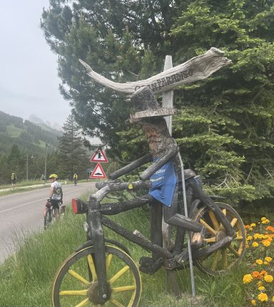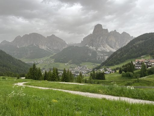 Die nächste Tour war von entspanntem Pedalieren geprägt (30km; 870m) und führte uns über LaVille nach Corvara. Wir haben die gut ausgebaute Straße genutzt; der Rad- und Wanderweg verläuft parallel und ist idyllischer. In Corvara hat man dann einen sehr guten Panoramablick auf die Berge und Täler.