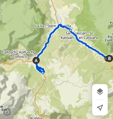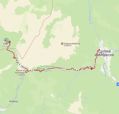 Der Start des Rundkurses ist von verschiedenen Orten möglich. Autofrei ist die Strecke zwischen 8:30 und 14:30. Wenn man morgens startet, kann ist es noch ein wenig kühl sein und man sollte entsprechend gekleidet sein. Es geht gegen den Uhrzeigersinn auf die Strecke. Wir starten in San Cassiano, weil die Steigungen und die ersten Pässe „leichter“ zu bewältigen sind. Somit pedalieren wir über Stern und Corvara zum Passo di Campolongo. Gleich am Ortsende von Corvara beginnt die Passage über die Nordseite mit einer Steigung von 10% und 10 Kehren. Nach 6,5km ist die wiesenartige Passhöhe erreicht und eine kurze Abfahrt (4km) mit 5 Kehren und bis 10% Gefälle entschädigt für den Anstieg. Dann geht es über Arabba und einer Straße mit schlechtem Belag nach Pieve. Und schon starten wir von der Westseite zum Passo di Falzarego. Bei einer maximalen Steigung von 8%. Unterhalb der Passhöhe gibt es einen unbeleuchteten Kehrentunnel (Beleuchtung) und einige gepflasterte Kehren (Vorsicht bei Nässe). Es bleibt Zeit die Bergwelt mit der mächtigen Cristalloformation zu genießen. Die Abfahrt verläuft über zahlreiche Kehren.