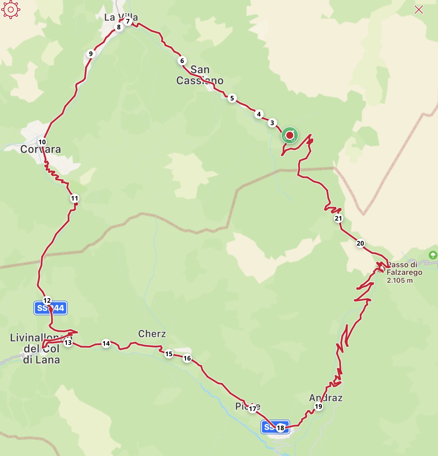 Der Start des Rundkurses ist von verschiedenen Orten möglich. Autofrei ist die Strecke zwischen 8:30 und 14:30. Wenn man morgens startet, kann ist es noch ein wenig kühl sein und man sollte entsprechend gekleidet sein. Es geht gegen den Uhrzeigersinn auf die Strecke. Wir starten in San Cassiano, weil die Steigungen und die ersten Pässe „leichter“ zu bewältigen sind. Somit pedalieren wir über Stern und Corvara zum Passo di Campolongo. Gleich am Ortsende von Corvara beginnt die Passage über die Nordseite mit einer Steigung von 10% und 10 Kehren. Nach 6,5km ist die wiesenartige Passhöhe erreicht und eine kurze Abfahrt (4km) mit 5 Kehren und bis 10% Gefälle entschädigt für den Anstieg. Dann geht es über Arabba und einer Straße mit schlechtem Belag nach Pieve. Und schon starten wir von der Westseite zum Passo di Falzarego. Bei einer maximalen Steigung von 8%. Unterhalb der Passhöhe gibt es einen unbeleuchteten Kehrentunnel (Beleuchtung) und einige gepflasterte Kehren (Vorsicht bei Nässe). Es bleibt Zeit die Bergwelt mit der mächtigen Cristalloformation zu genießen. Die Abfahrt verläuft über zahlreiche Kehren.