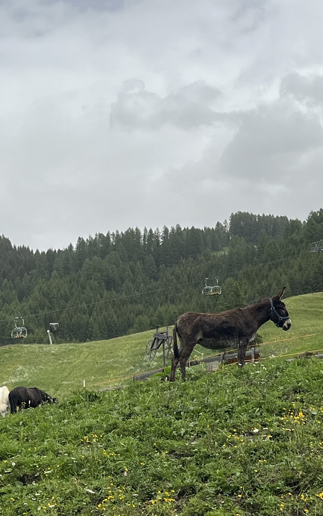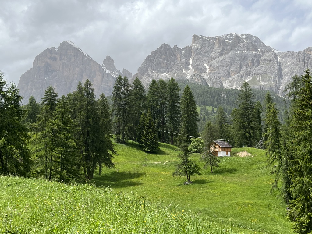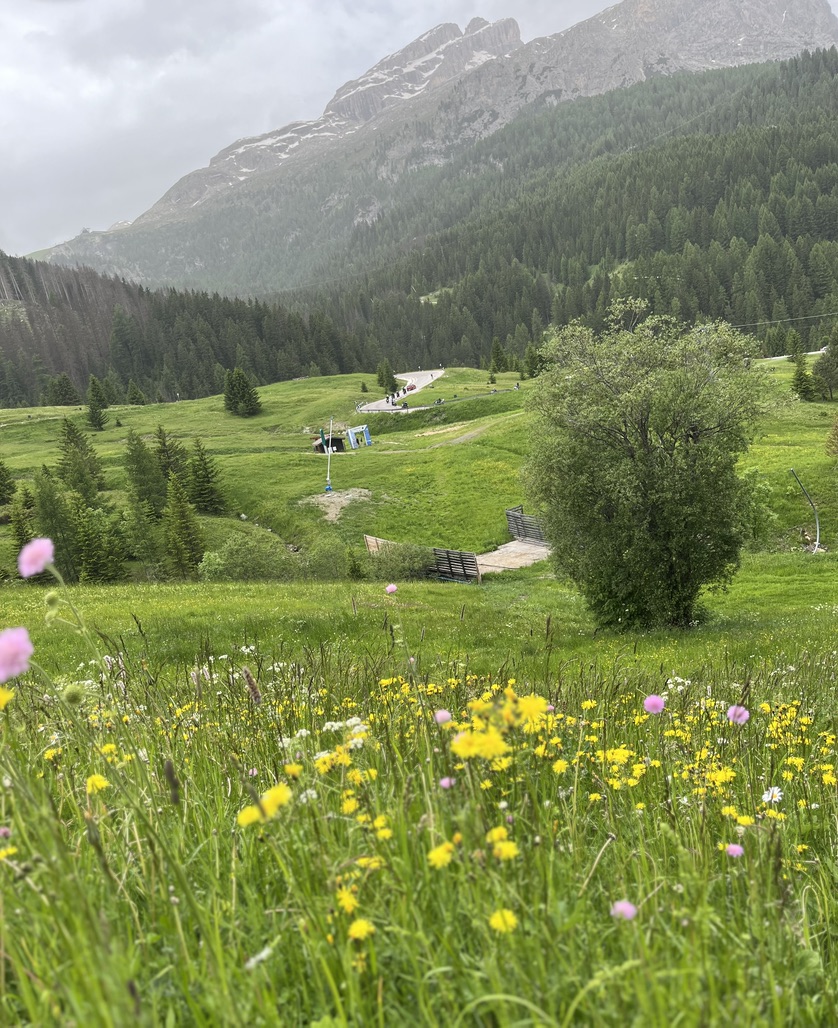 Die Landschaft kann und soll genossen werden, denn die Dolomiten sind grandios und imposant, aber auch die bunten Wiesen sind reizvoll.
