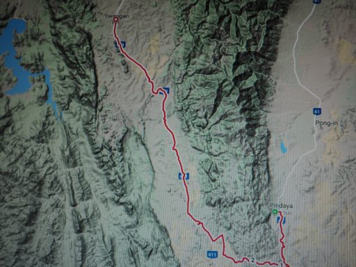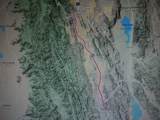 Ankunft ist Yangon (Rangun), die Hauptstadt des Landes und hier kann auch sogleich die erste Pagode, die Shwedagon Pagode, besichtigt werden; vor allem auch der mächtige Stupa. Sehr eindrucksvoll. Nach einer kurzen Akklimatisierung geht es mit dem Flugzeug ins Landesinnere. Kalaw ist das Ziel und Ausgangspunkt der Radtour. Auf zum Teil unbefestigten Straßen geht es in Richtung Süden (75km; 1.215 Höhenmeter). Auf dem Shan-Plateau können kleine Dörfer und das Treiben der Bergbevölkerung beobachtet werden; auch weil der Verkehr sehr gering ist.