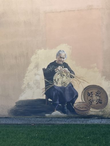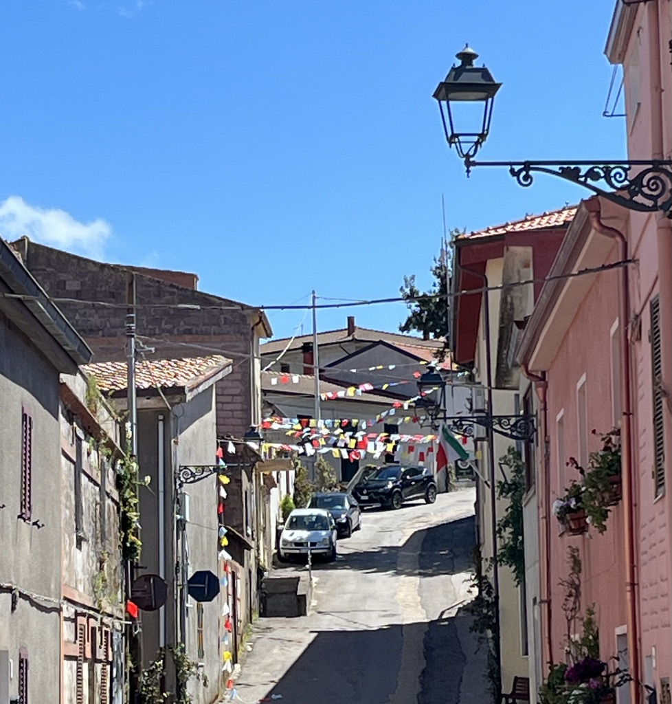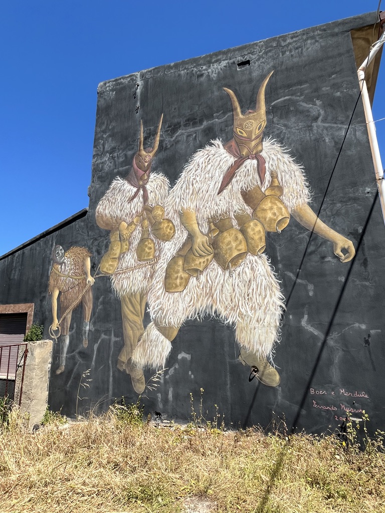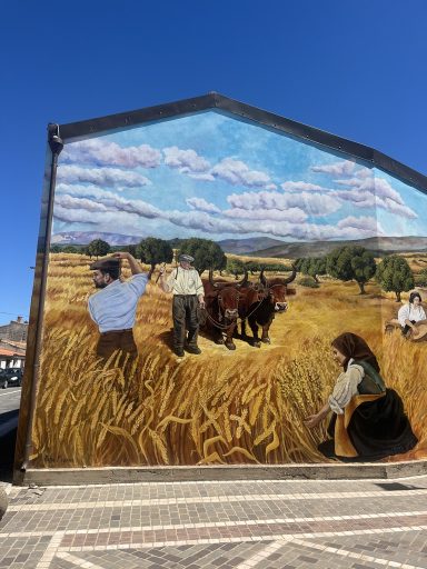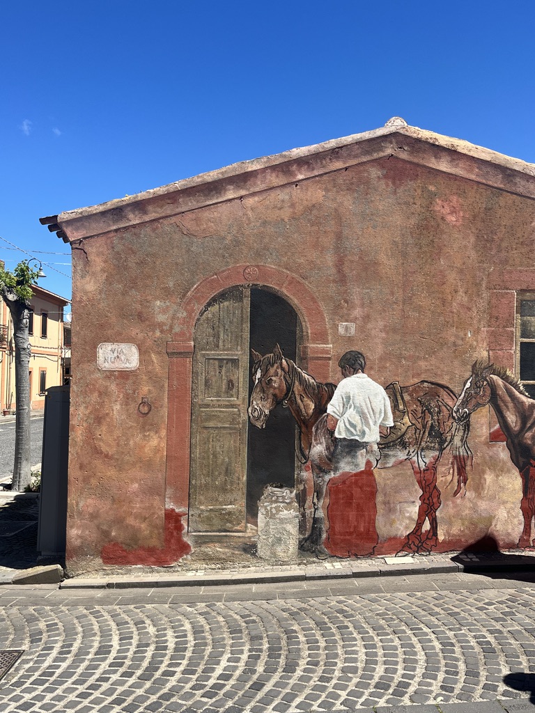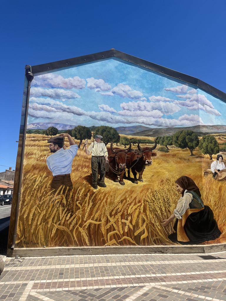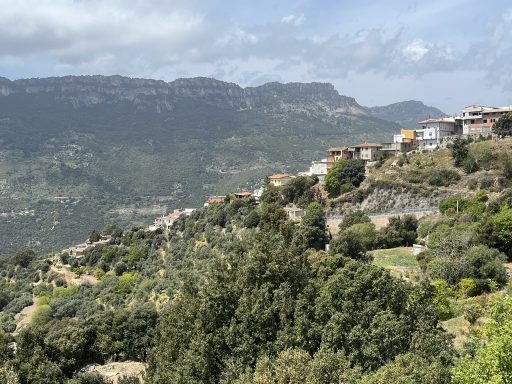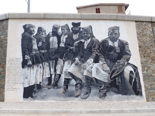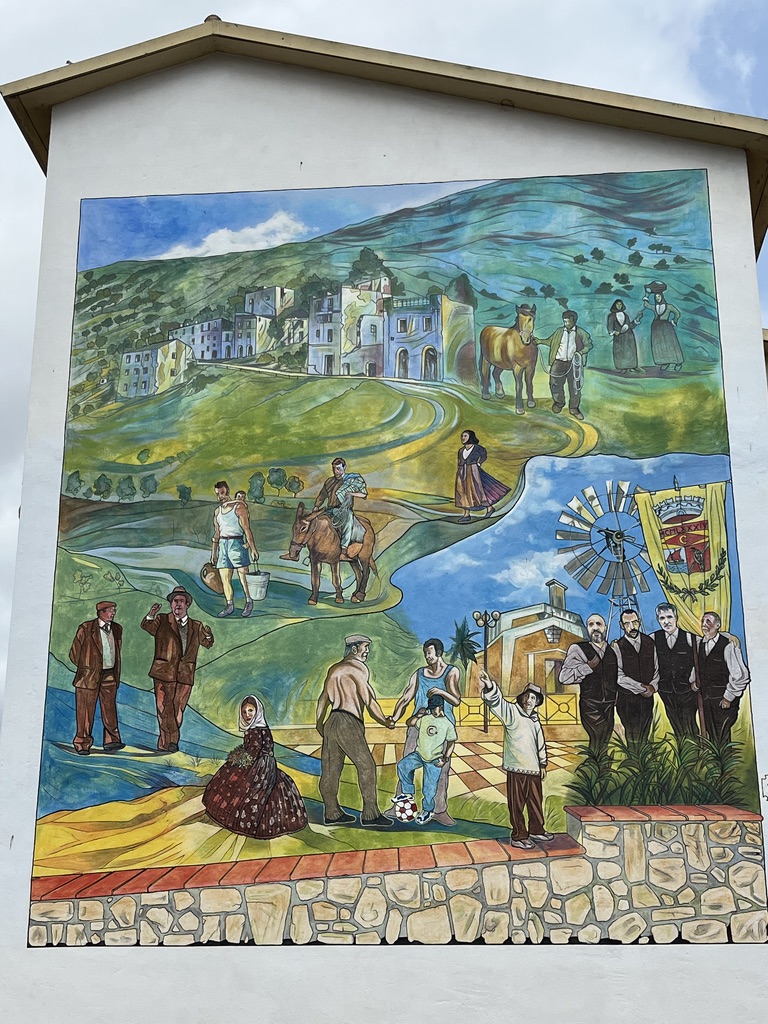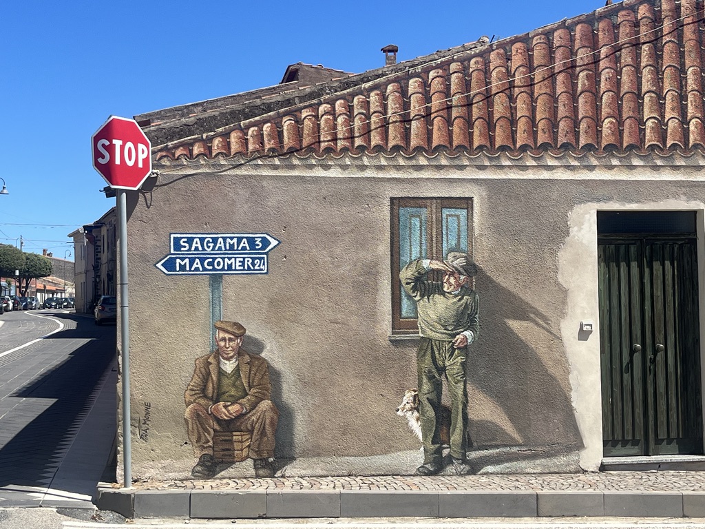 Auf dem Weg nach Tresnuraghes sollte Barumini besucht werden, denn hier kann eine gut erhaltene Festung der Nuraghen (Su Nuraxi) besucht werden. Tresnuraghes ist die Basis für zwei Radtouren. Die erste Tour führt uns nach Fusio, Padina und Montresta (65km; 1.000m). Diese Fahrt ins Landesinnere führt uns nach Fusio. Hier gibt es sehr viele Wandbilder, die das Leben auf Sardinien sehr eindrucksvoll widerspiegeln. Von Padria, einer schönen Kleinstadt, ging es wieder in die Berge nach Montresta. Am Wegesrand Mohnblumen, Ginster, Mittagsblumen und Korkeichen.