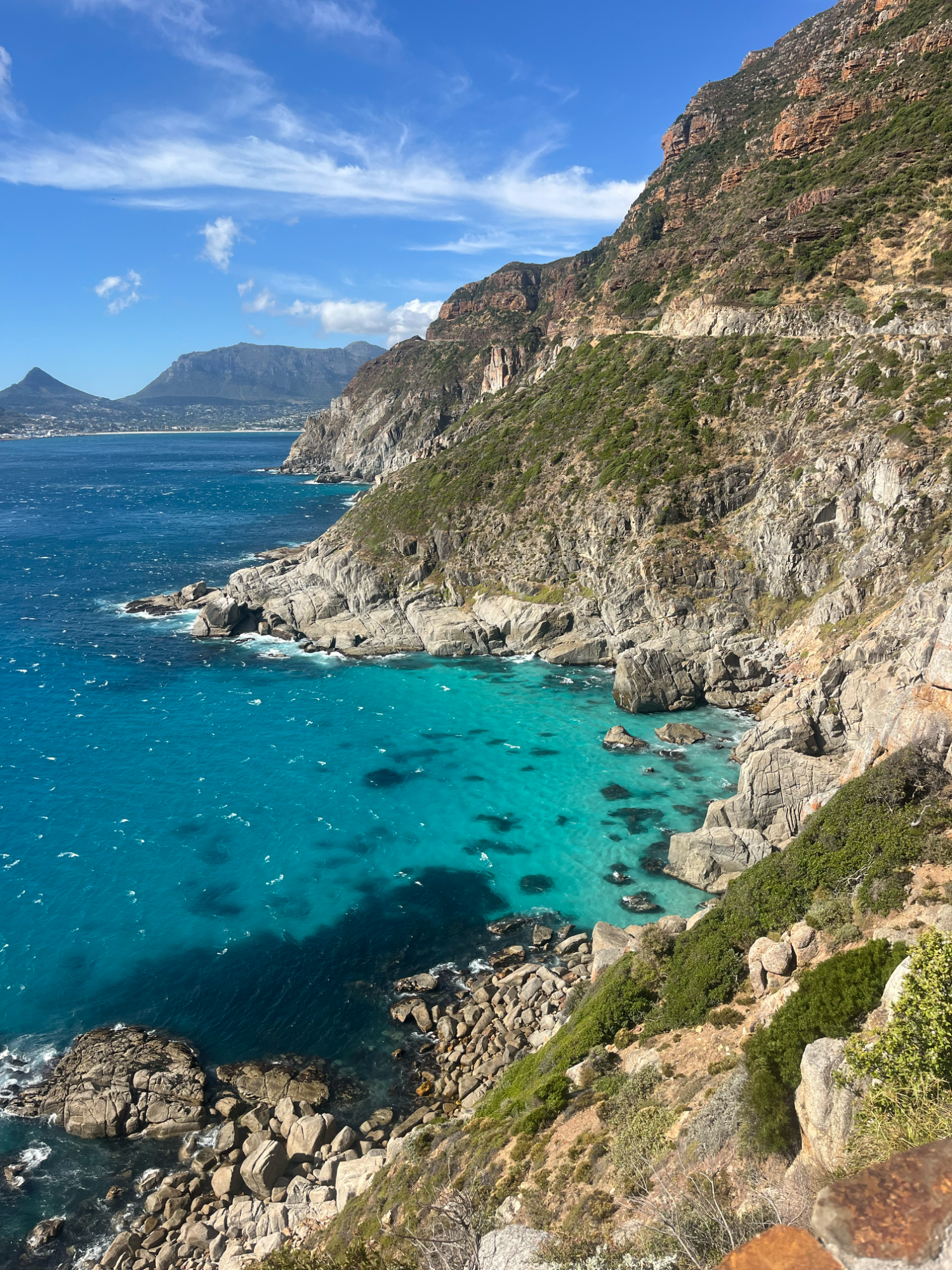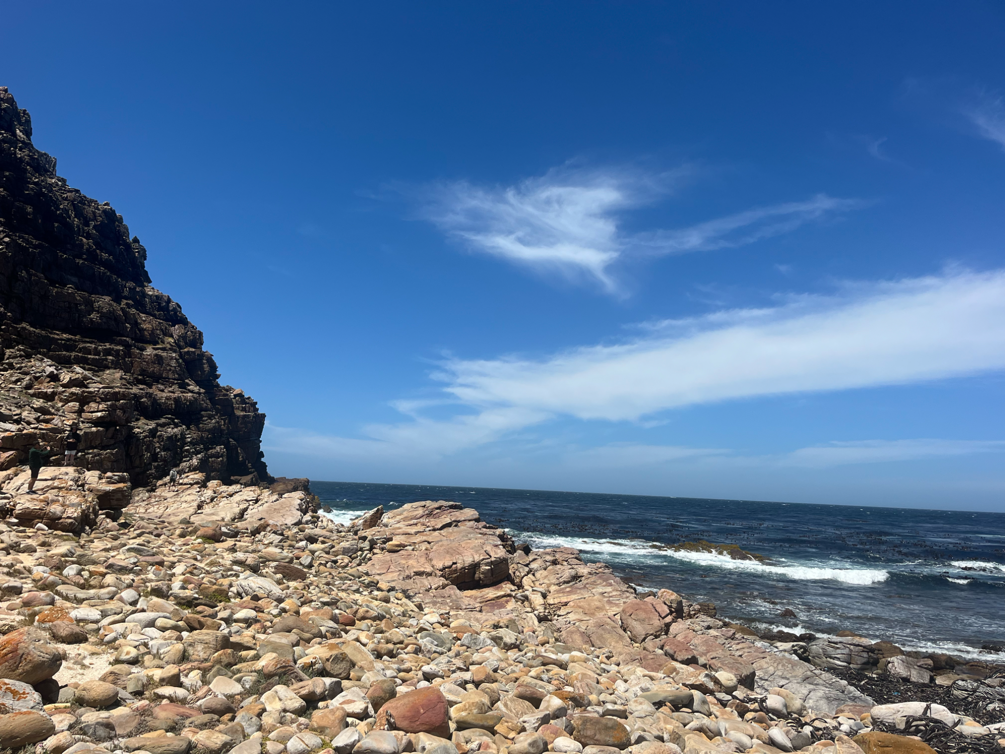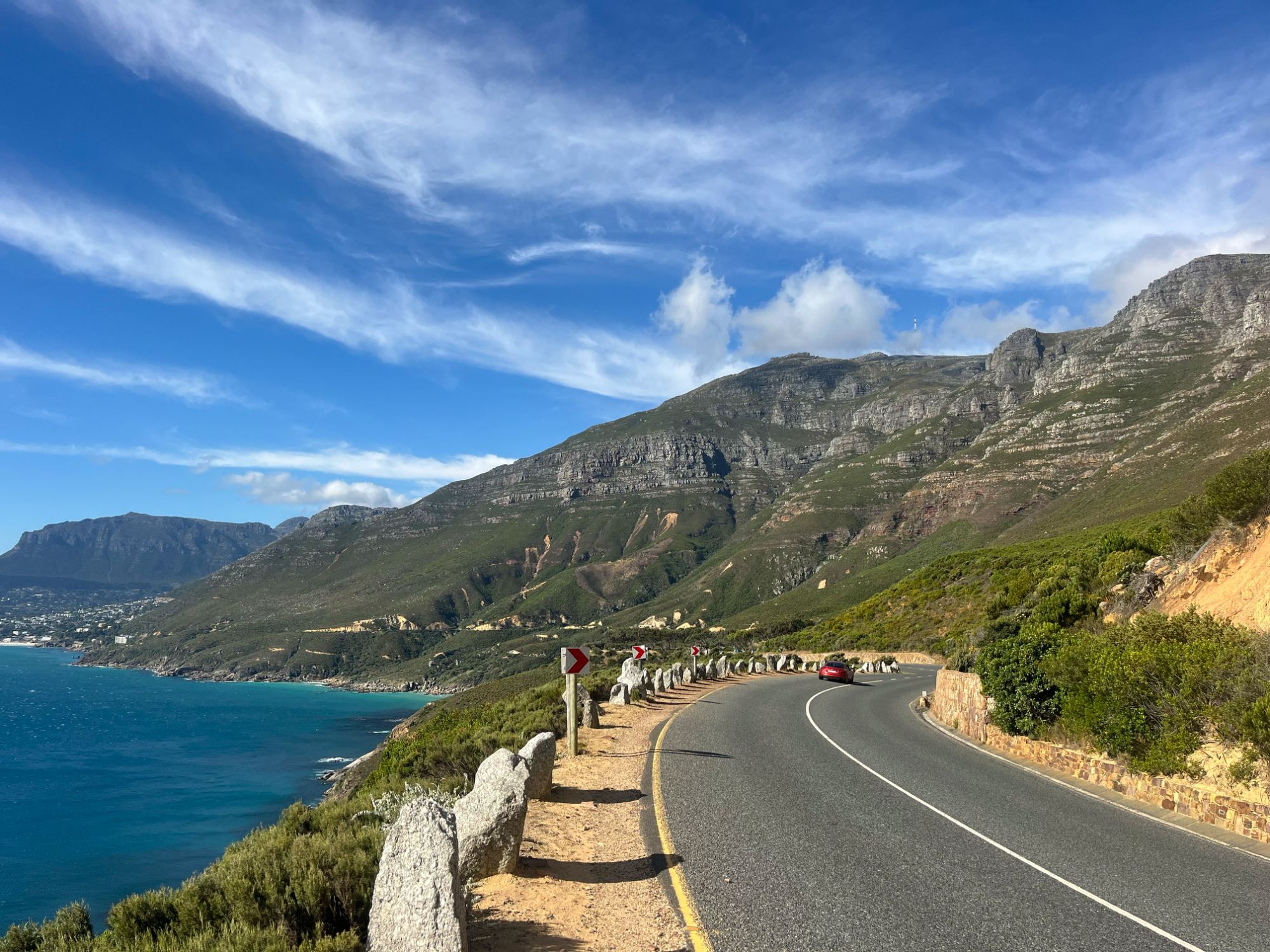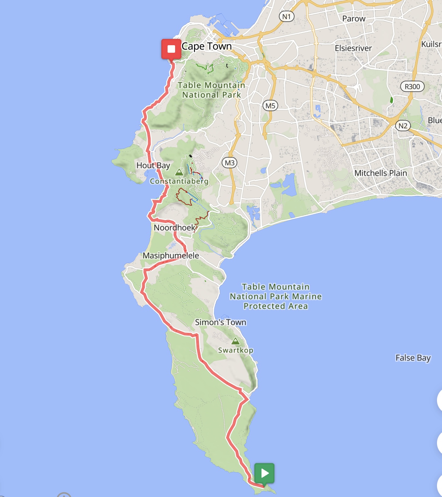 Anschließend ging es über die felsumrandete False Bay (Valsbaai oder „Falsche Bucht“) zum Kap der Guten Hoffnung, an der Südspitze Afrikas. Der Name basiert auf dem Umstand, dass Segelschiffe durch den starken Wind und die Strömung häufig an die Felsen gedrückt wurden und dort aufliefen. Die Rückfahrt per MTB erfolgte auf der Westseite der Kap-Halbinsel nach Kapstadt. Die Route über den steilen und windigen Chapman’s Peak und Hout Bay gilt zu Recht als eine der atemberaubendsten Strecken in Südafrika. Nicht umsonst findet hier jährlich das populäre Cape Town Cycle Tour Radrennen mit über 35.000 Teilnehmern aus aller Welt statt.