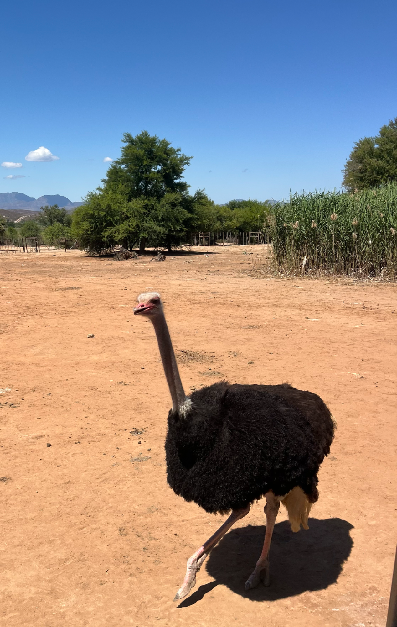 Weiter ging es von De Rust zu den Höhlen von Cango Dripstone. Die Strecke verlief auf einer hügeligen Piste am Fuße der Swartberge entlang. Die „schwarzen Berge“ sind ursprünglich rötlich gefärbt, aber durch Erosion und Pflanzenbewuchs dunkel getönt. Eine lange Abfahrt war die Belohnung für den Anstieg. Durch die Schoemans-Schlucht ging es nach Oudtshoorn, dem Zentrum der Straußenzucht.