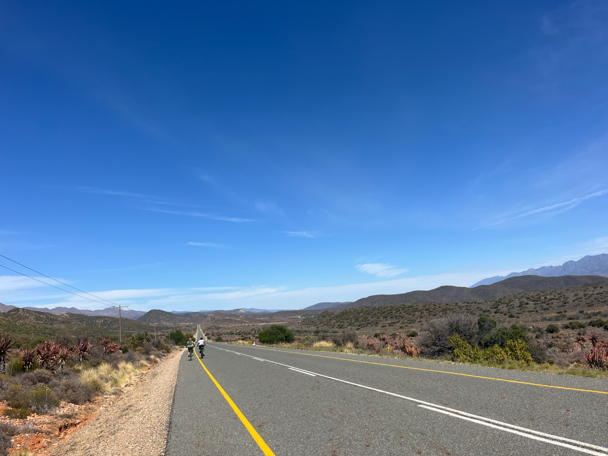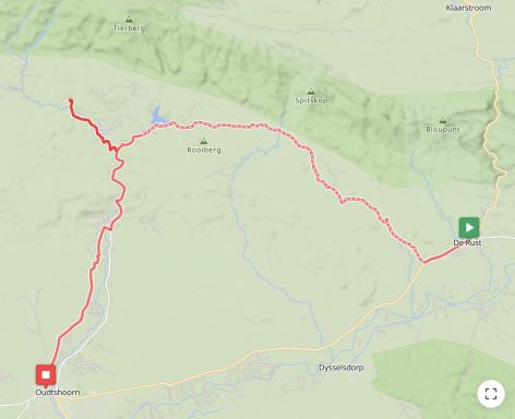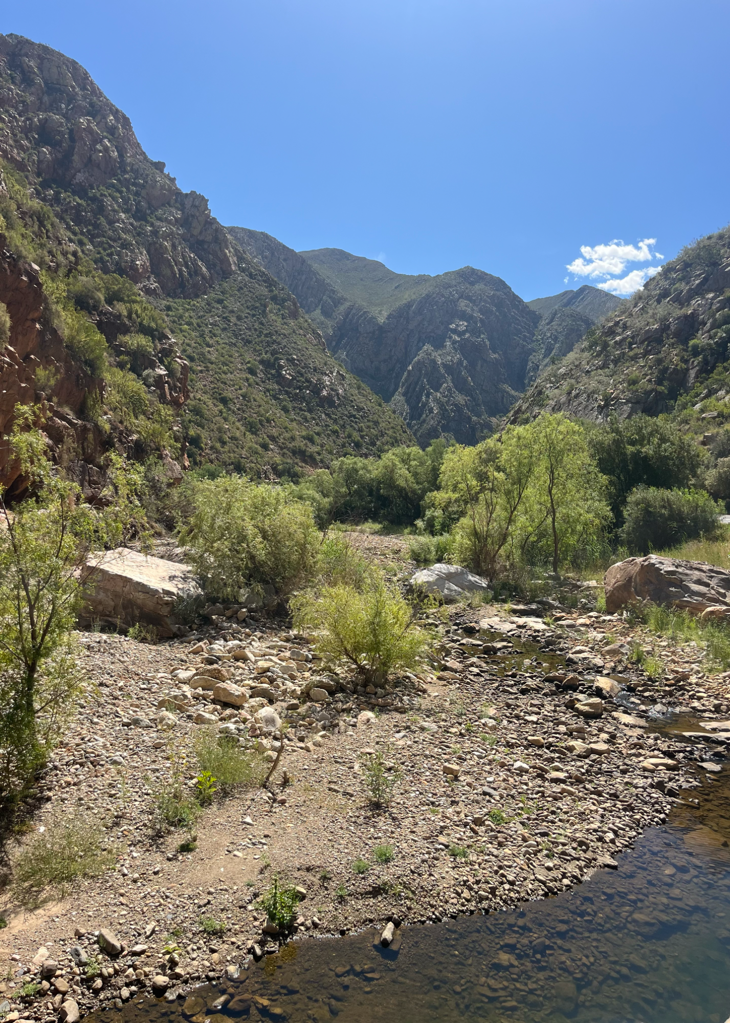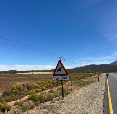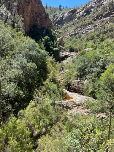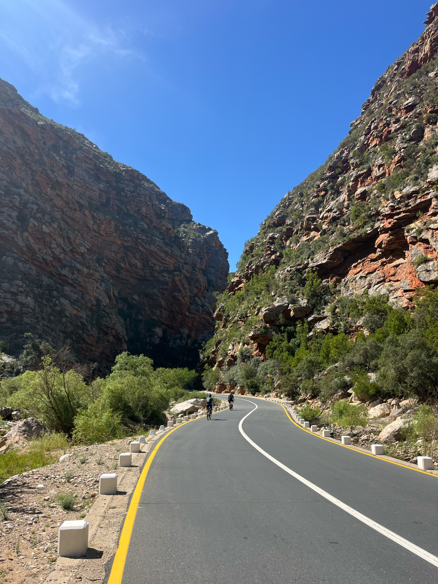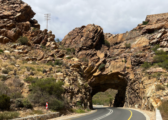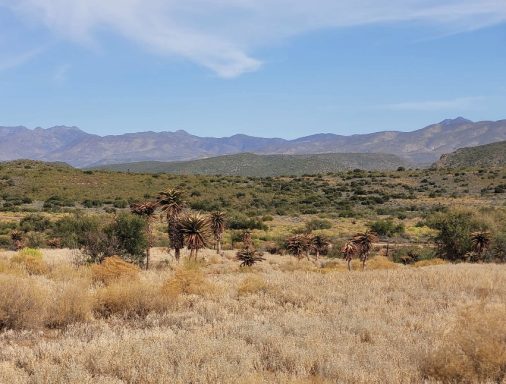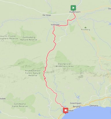 Am nächsten Tag pedalierte ich durch die Weite der Kleinen Karoo, einer Halbwüstenlandschaft. In der Sprache der San bedeutet der Name „trockenes, dürres, steiniges Land“; zu Recht. Die Ausblicke auf die Swartberge waren beeindruckend, vor allem die Panoramaaussicht. Abseits der Straße konnten wieder unzählige Sukkulenten auf dem Weg nach De Rust bestaunt werden. Natürlich durfte ein Besuch von Meiringspoort mit den bis zu 700 m hohen Felswänden nicht fehlen. Entstanden ist die schmale Passage, als der Fluss Groot sich seinen Weg durch die Swartberge gebahnt hat. Abschließend wurde auch ein Wasserfall besucht, der jedoch jahreszeitlich eher ein Rinnsal war.