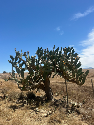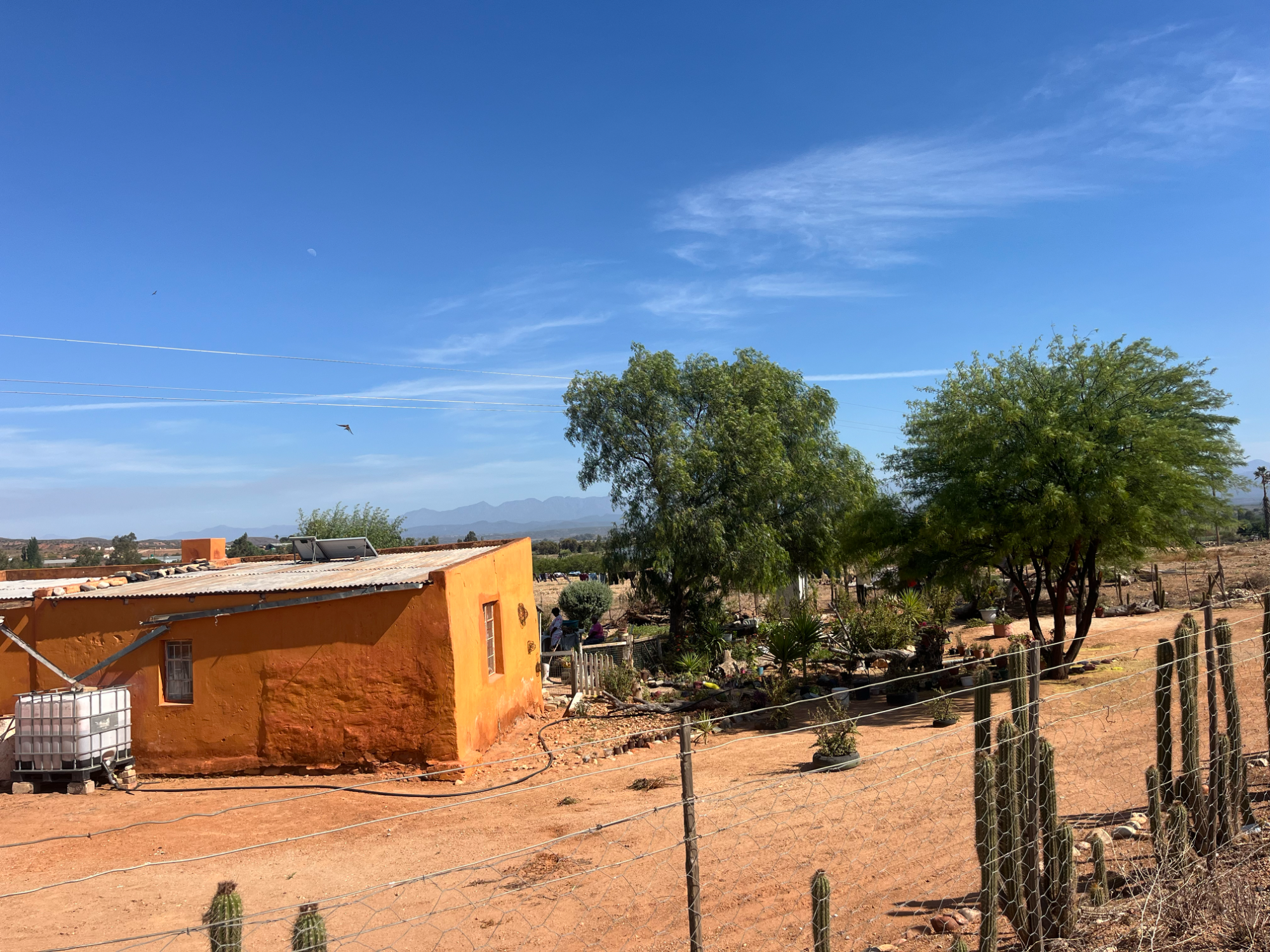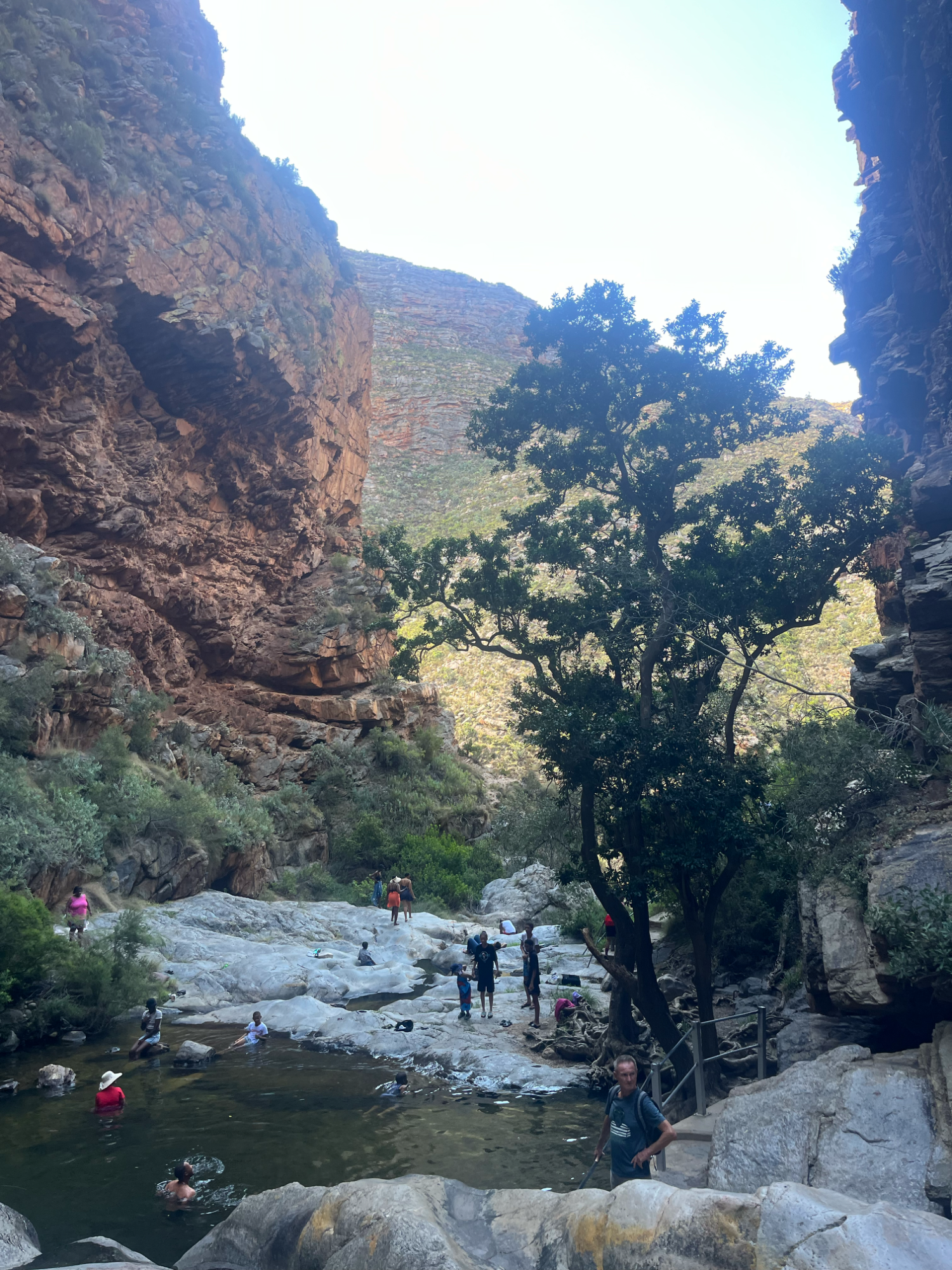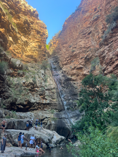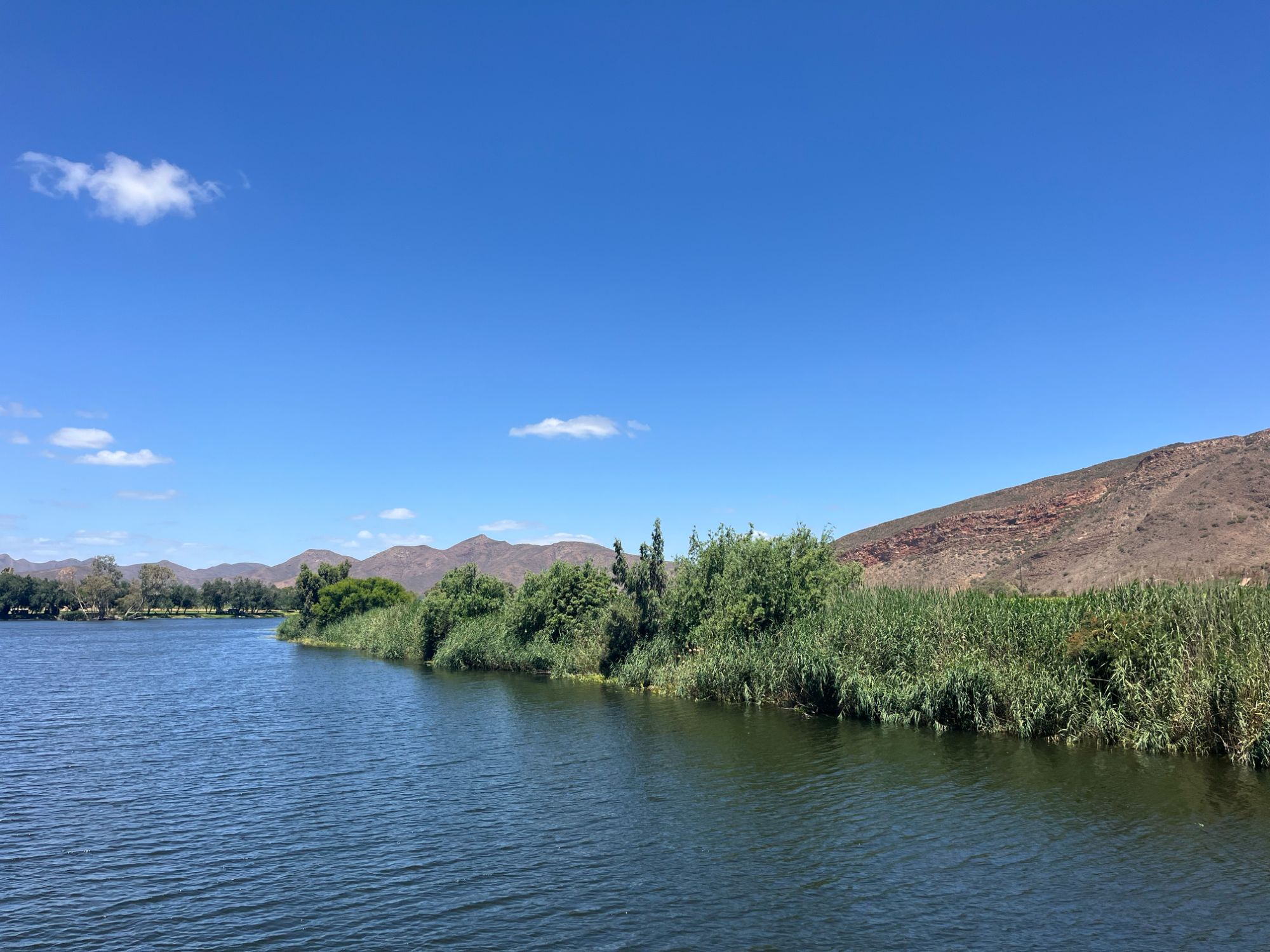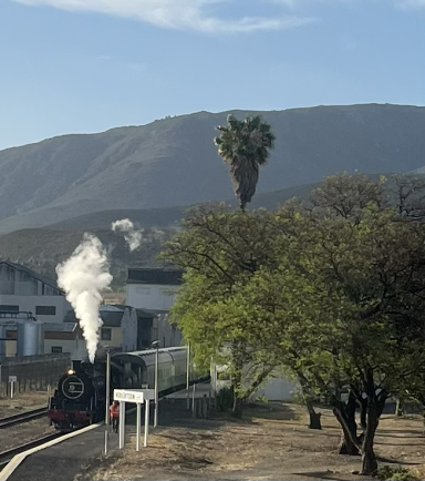 Am nächsten Tag pedalierte ich durch die Weite der Kleinen Karoo, einer Halbwüstenlandschaft. In der Sprache der San bedeutet der Name „trockenes, dürres, steiniges Land“; zu Recht. Die Ausblicke auf die Swartberge waren beeindruckend, vor allem die Panoramaaussicht. Abseits der Straße konnten wieder unzählige Sukkulenten auf dem Weg nach De Rust bestaunt werden. Natürlich durfte ein Besuch von Meiringspoort mit den bis zu 700 m hohen Felswänden nicht fehlen. Entstanden ist die schmale Passage, als der Fluss Groot sich seinen Weg durch die Swartberge gebahnt hat. Abschließend wurde auch ein Wasserfall besucht, der jedoch jahreszeitlich eher ein Rinnsal war.