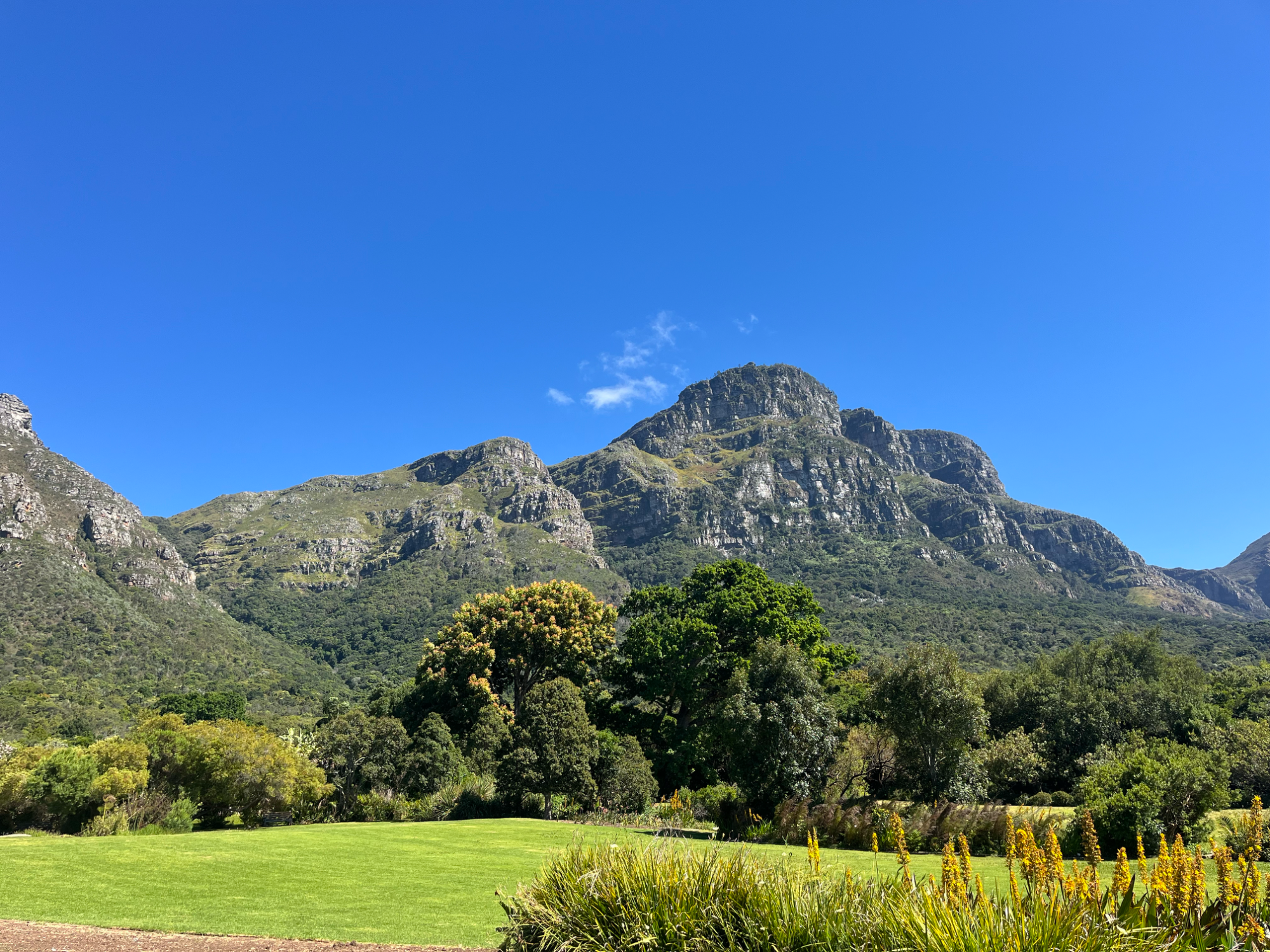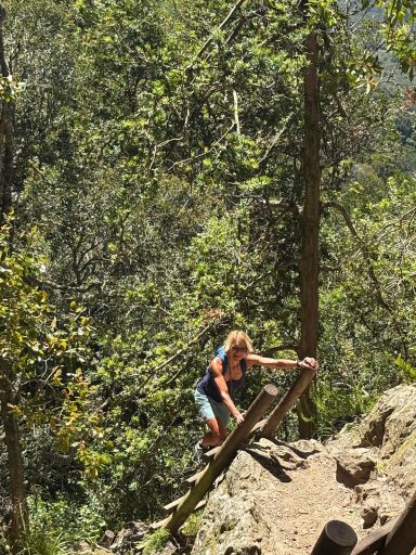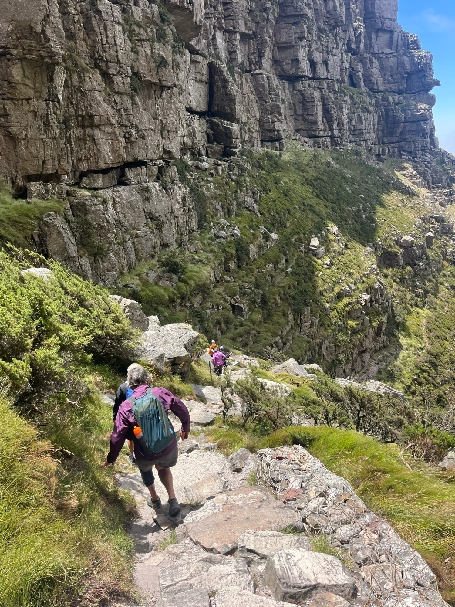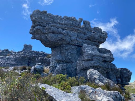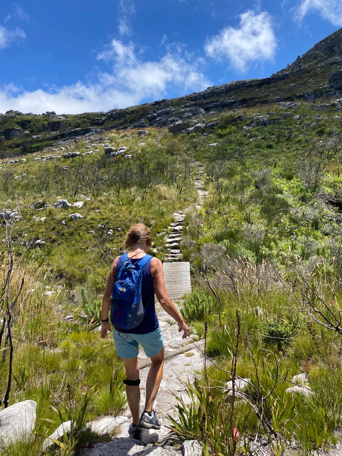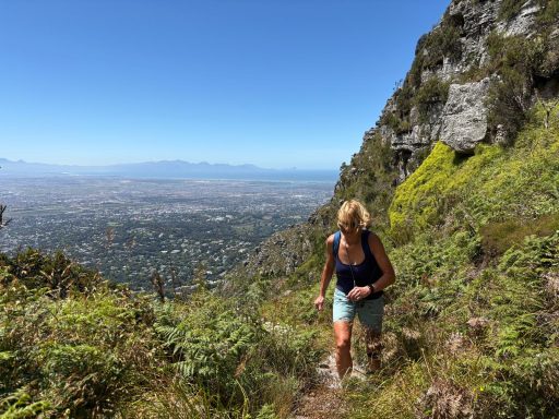 Am letzten Tag der Radreise hatte das MTB einen Ruhetag verdient und so stand eine Wanderung auf den Tafelberg bei Kapstadt auf dem Programm. Natürlich wurde auch hier das Wetter berücksichtigt, denn bei Windböen mit 65 km/h Windgeschwindigkeit war die Fahrt mit der Seilbahn nicht möglich. Also wanderten und kletterten wir in einer kleinen Gruppe über Geröll, auf Leitern und Stegen auf den Tafelberg. Die blühende Vegetation konnte bei diesem erschwerten Aufstieg, aber auch Abstieg, umso mehr genossen werden. Auch die Panoramasicht auf Kapstadt war atemberaubend, genauso wie der Blick auf Pitekopp George und den Löwenkopf. Es war eine Wanderung über 15 km und 1.000 m Höhenmeter. Fast unbeschreiblich!