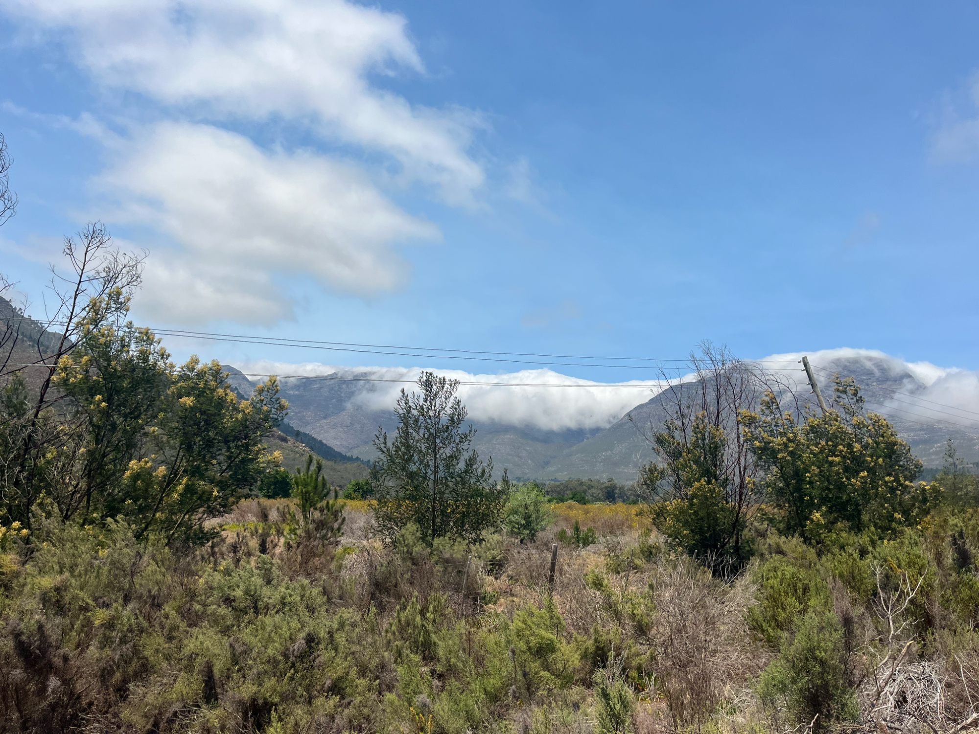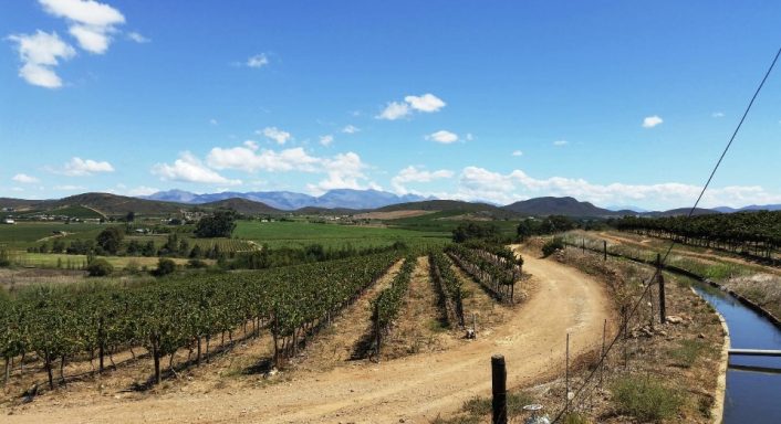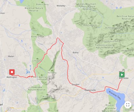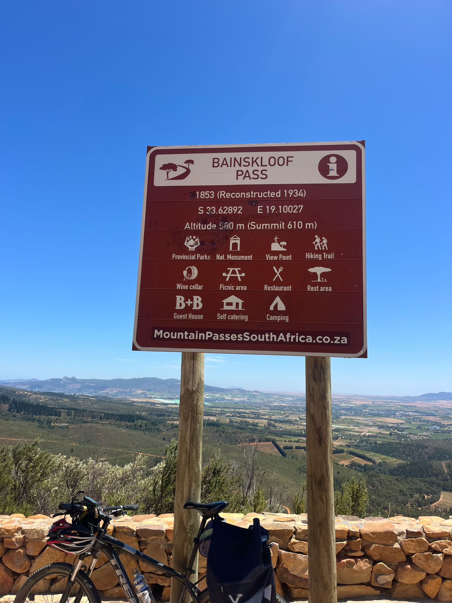 Die nächste Etappe führte an Weingütern vorbei und über Rawsonville, einer kleinen Weinbau- und Bauerngemeinde, in das ruhige Slangkoptal, d. h. das Tal der Schlangenköpfe. Anschließend pedalierte ich durch die Bainskloof-Schlucht am White River entlang. Die unter Denkmalschutz stehende Straße wurde vor 170 Jahren erbaut und ist nun asphaltiert. Die Strecke ist eine landschaftliche Schönheit und gilt als nationales Denkmal. Von der Passhöhe auf 600 m Höhe kann man bei gutem Wetter in 70 km Entfernung den Tafelberg sehen. Über eine lange Abfahrt erreichte ich den Weinort Wellington.