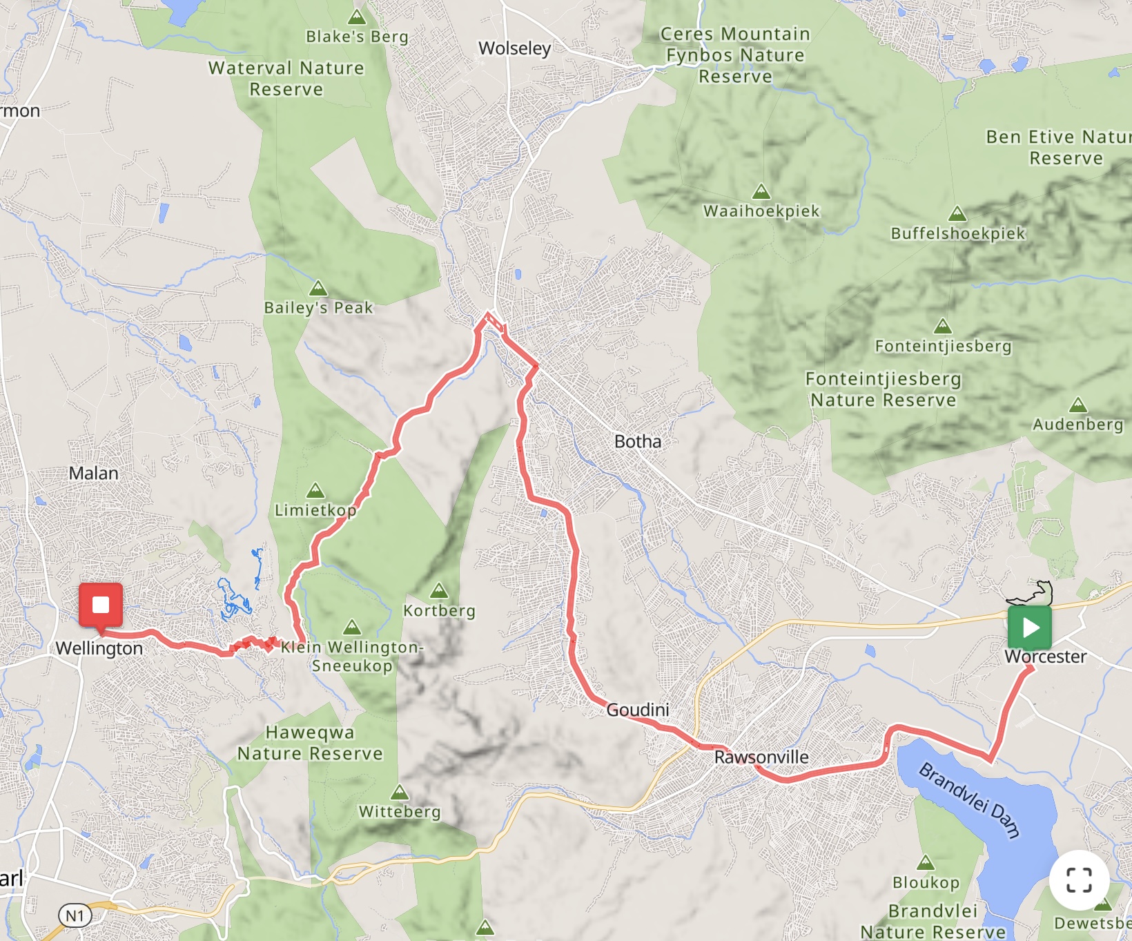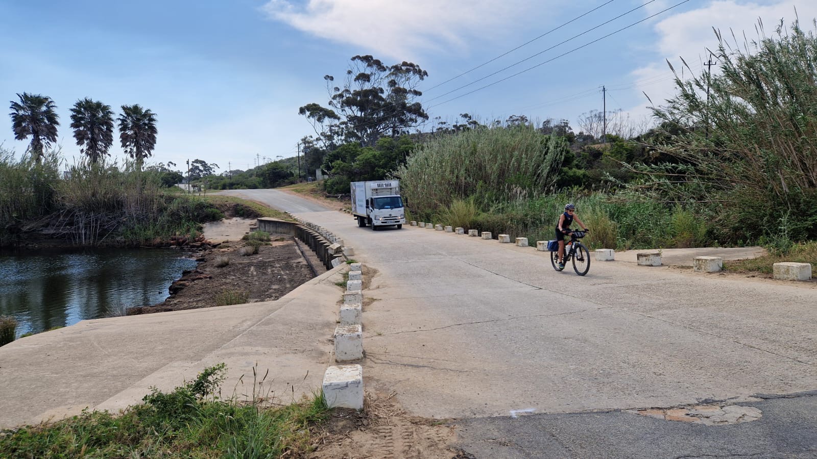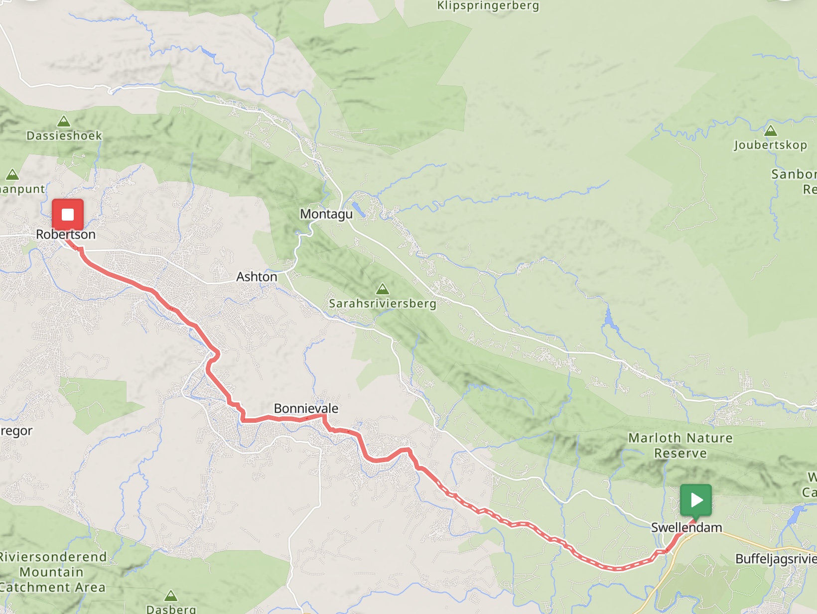 Die nächste Etappe führte an Weingütern vorbei und über Rawsonville, einer kleinen Weinbau- und Bauerngemeinde, in das ruhige Slangkoptal, d. h. das Tal der Schlangenköpfe. Anschließend pedalierte ich durch die Bainskloof-Schlucht am White River entlang. Die unter Denkmalschutz stehende Straße wurde vor 170 Jahren erbaut und ist nun asphaltiert. Die Strecke ist eine landschaftliche Schönheit und gilt als nationales Denkmal. Von der Passhöhe auf 600 m Höhe kann man bei gutem Wetter in 70 km Entfernung den Tafelberg sehen. Über eine lange Abfahrt erreichte ich den Weinort Wellington.