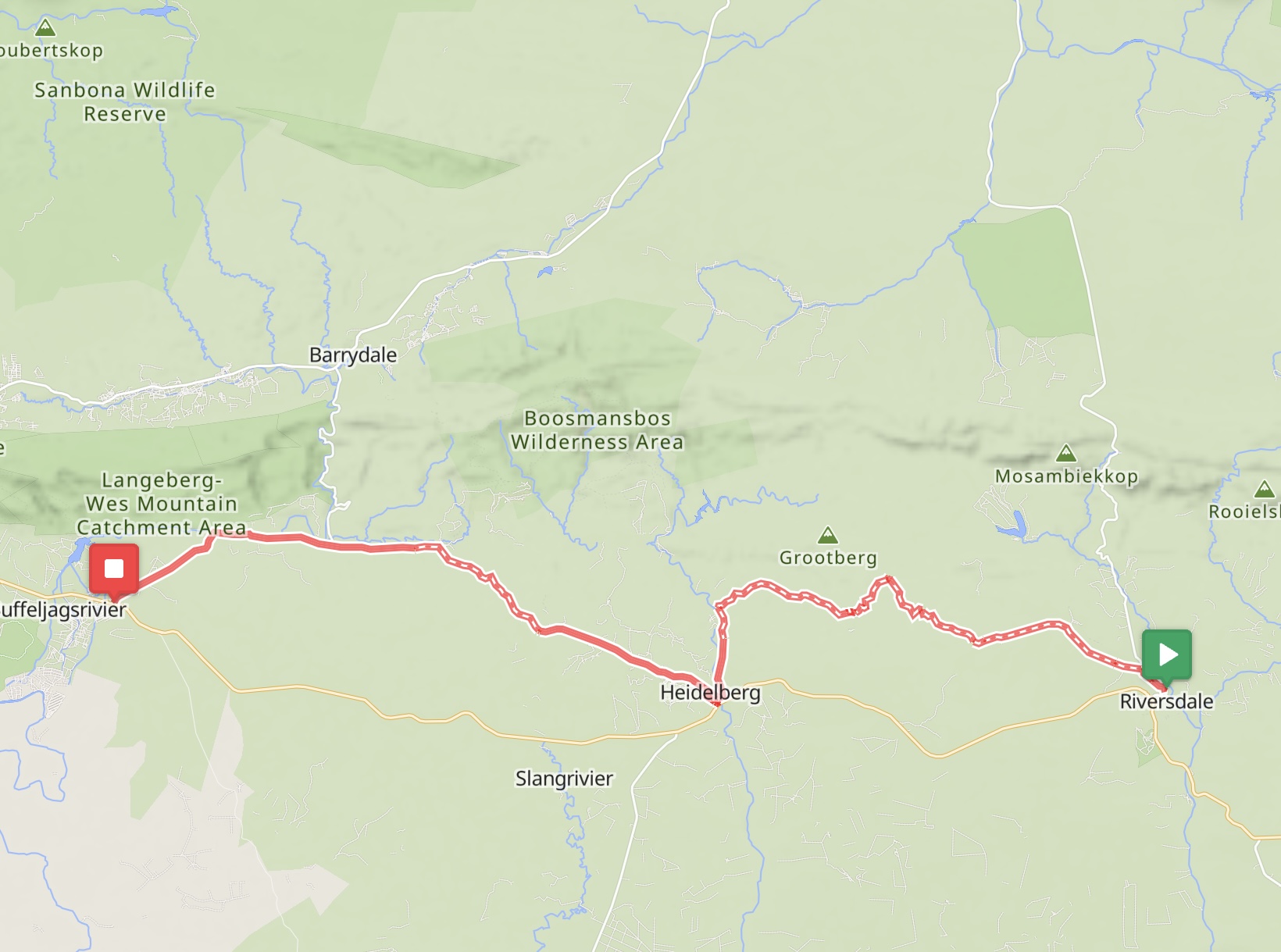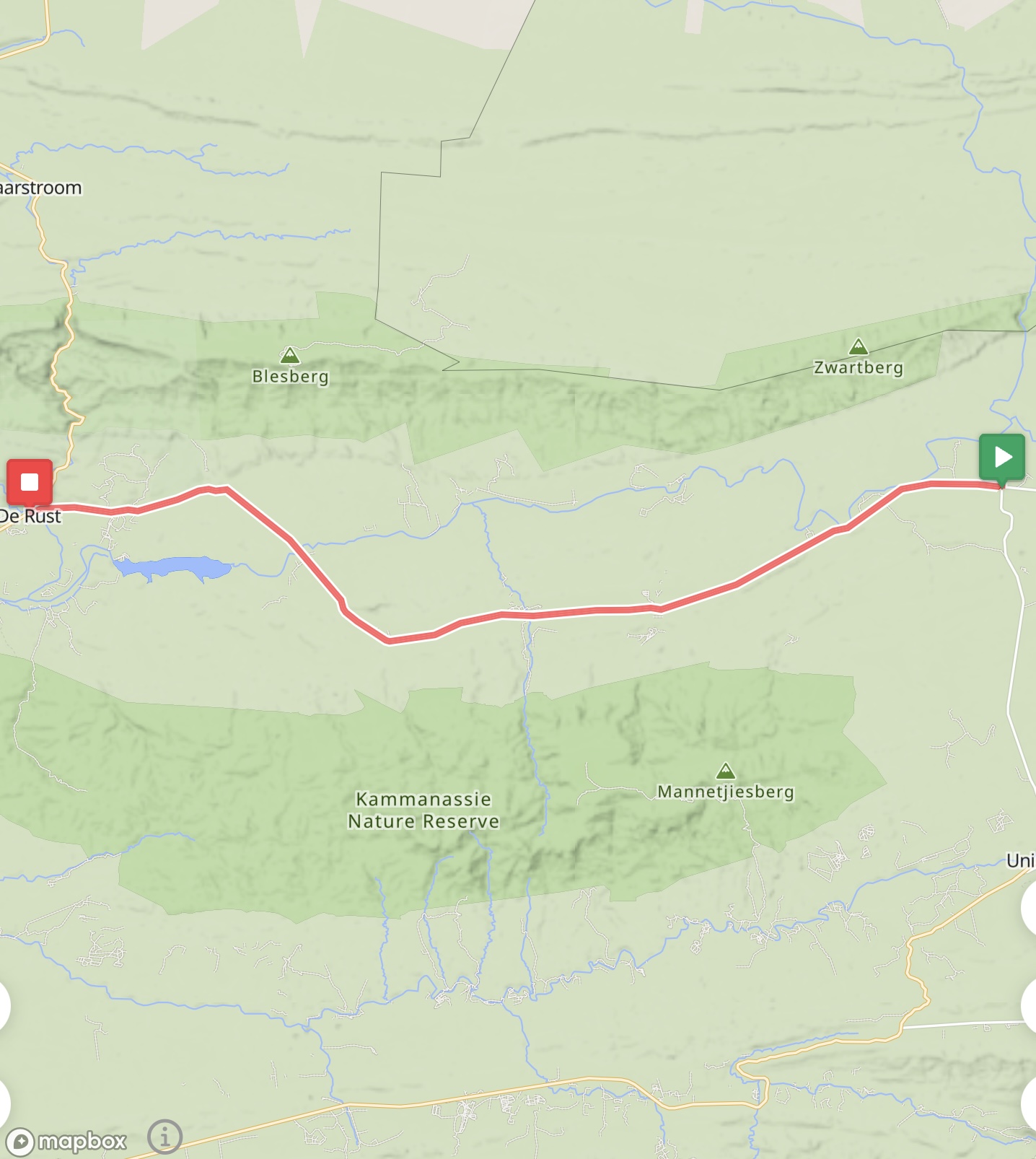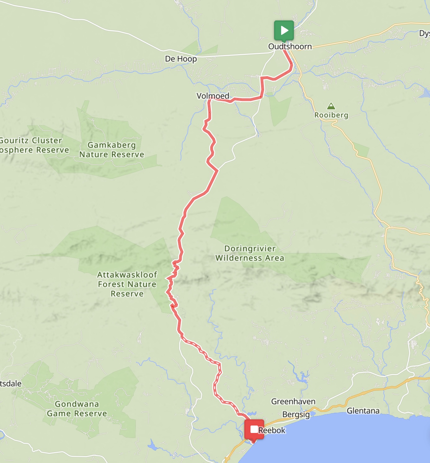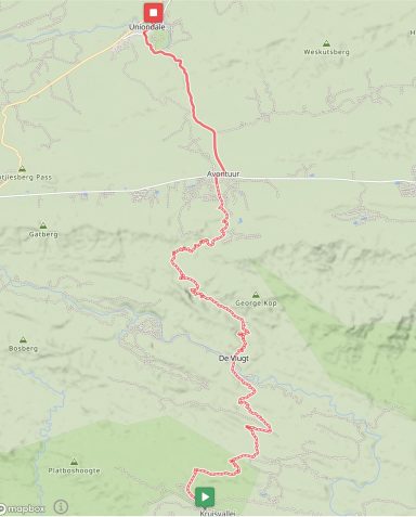 Ausgeruht ging es am nächsten Tag von der Lagunenstadt Knysna nach Uniondale. Die Stadt liegt am Kammanassie River und am Fuße des Tsitsikamma-Gebirges. Hier gab es vornehmlich Offroad-Strecken. Kein Wunder, denn Uniondale ist Ausgangspunkt des Karoo-to-Coast-Mountainbike-Rennens, das nach Knysna über den Prince Alfred’s Pass führt. Ich passierte auch diesen Pass (1.050 m). Eine willkommene Ablenkung war die Fahrt durch den Urwald, die Kiefernwälder, die vielen Akazien und die vielen blühenden Sukkulenten.
