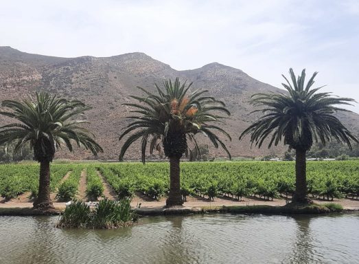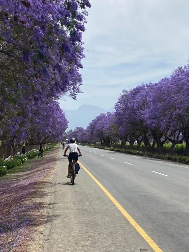 Die nächste Radetappe führte erst auf einer Offroad-Piste, später auf einer asphaltierten Straße nach Bonnievale. Die flache Strecke im Breedetal führte an einigen Weingütern und Obstplantagen vorbei. Aber es wurden auch der südafrikanische Nationalvogel, der Paradieskranich, Springböcke und die blau blühenden Palisanderbäume am Straßenrand bestaunt. Natürlich wurde die Möglichkeit einer Weinverkostung genutzt. Schließlich wurde das Etappenziel Robertson erreicht.