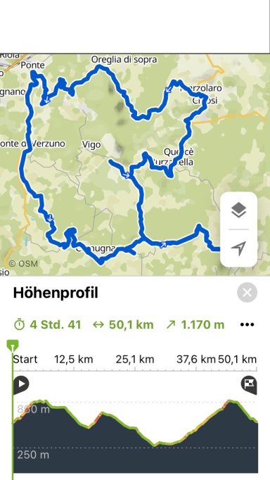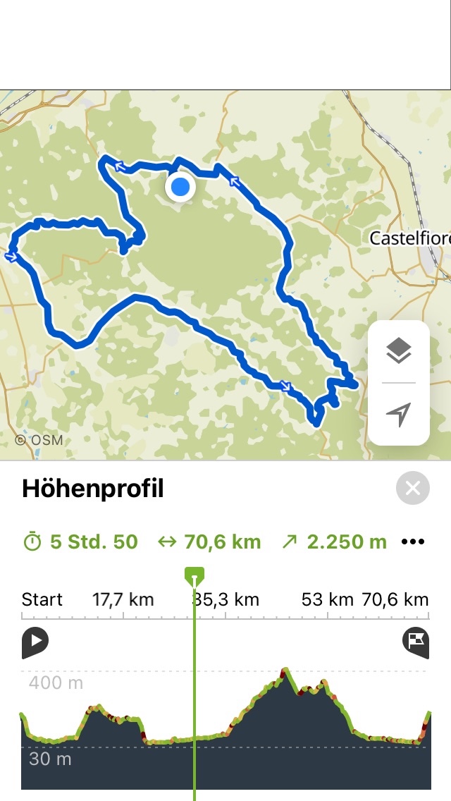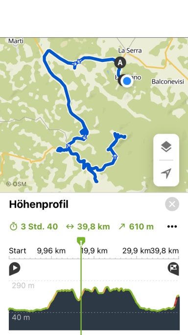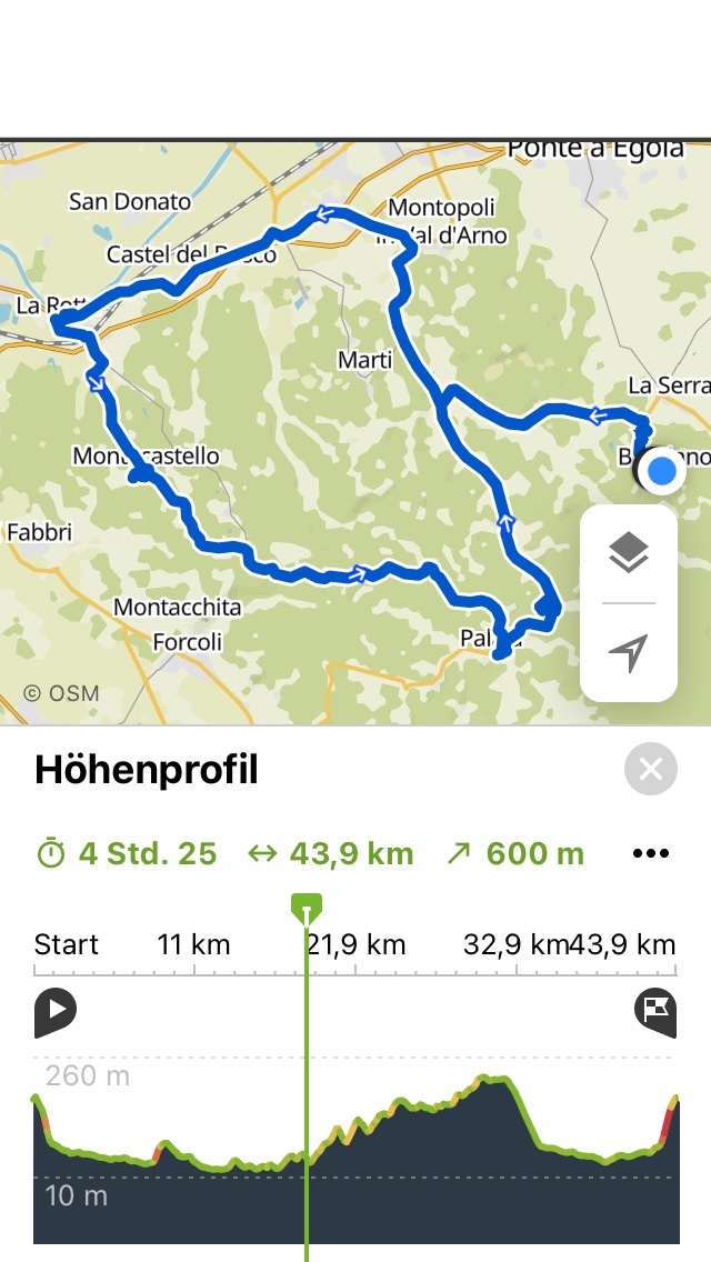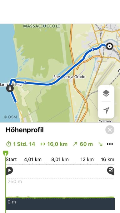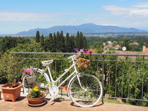 Unsere Radtouren haben wir jeweils in ländlicher Umgebung gemacht, z.B. Bei Mogne (28km; 640 Höhenmeter), Falina (50km; 1.100m), Pisa (35km; 120m), Bucciano (38km; 560m), Castelfiora (70km; 810m) und Bucciano (44km; 545m). Das Höhenprofil war meist flach und bei unserem Besuch im Juni duftete es überall (Pinien, Ginster und Jasmin). Die Straßen und Wege waren in einem guten Zustand und wir konnten die Cyclo Cross Räder entsprechend gut benutzen. Natürlich sind Rennräder auch gut geeignet, wie die zahlreichen Rennradfahrer eindrucksvoll bestätigt haben.