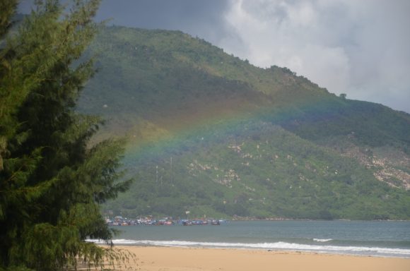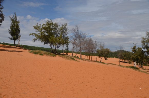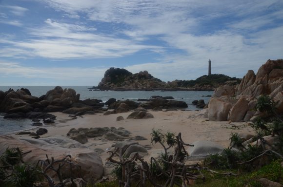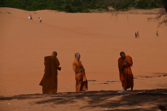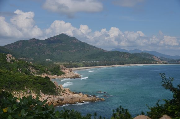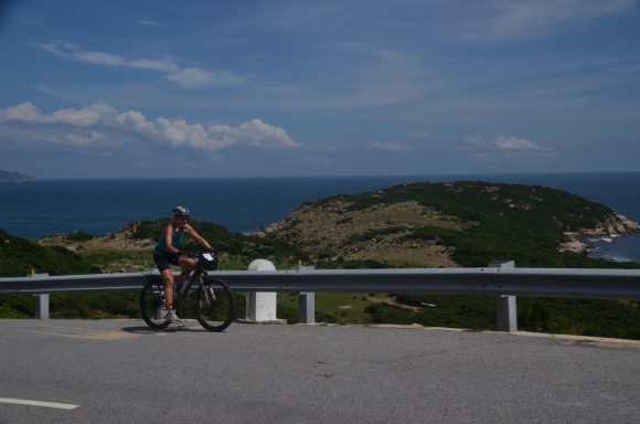 An der Küste geht es vorbei an schönen Stränden, vorgelagerten Inseln und vielen kleinen Restaurants mit Meeresfrüchten nach Nha Trang (35km). Im Hintergrund ist die imposante Berglandschaft. An der Küste geht es weiter nach Vinh Hy (25km); diesmal mit einigen leichten Anstiegen, aber auch Abstiegen. Und noch immer geht es an der Küste weiter nach Mui Ne (25km). Auch hier kann der maritime Einfluss beobachtet werden: Garnelenzucht, Salzlagunen und rote (!) und weiße Dünen.